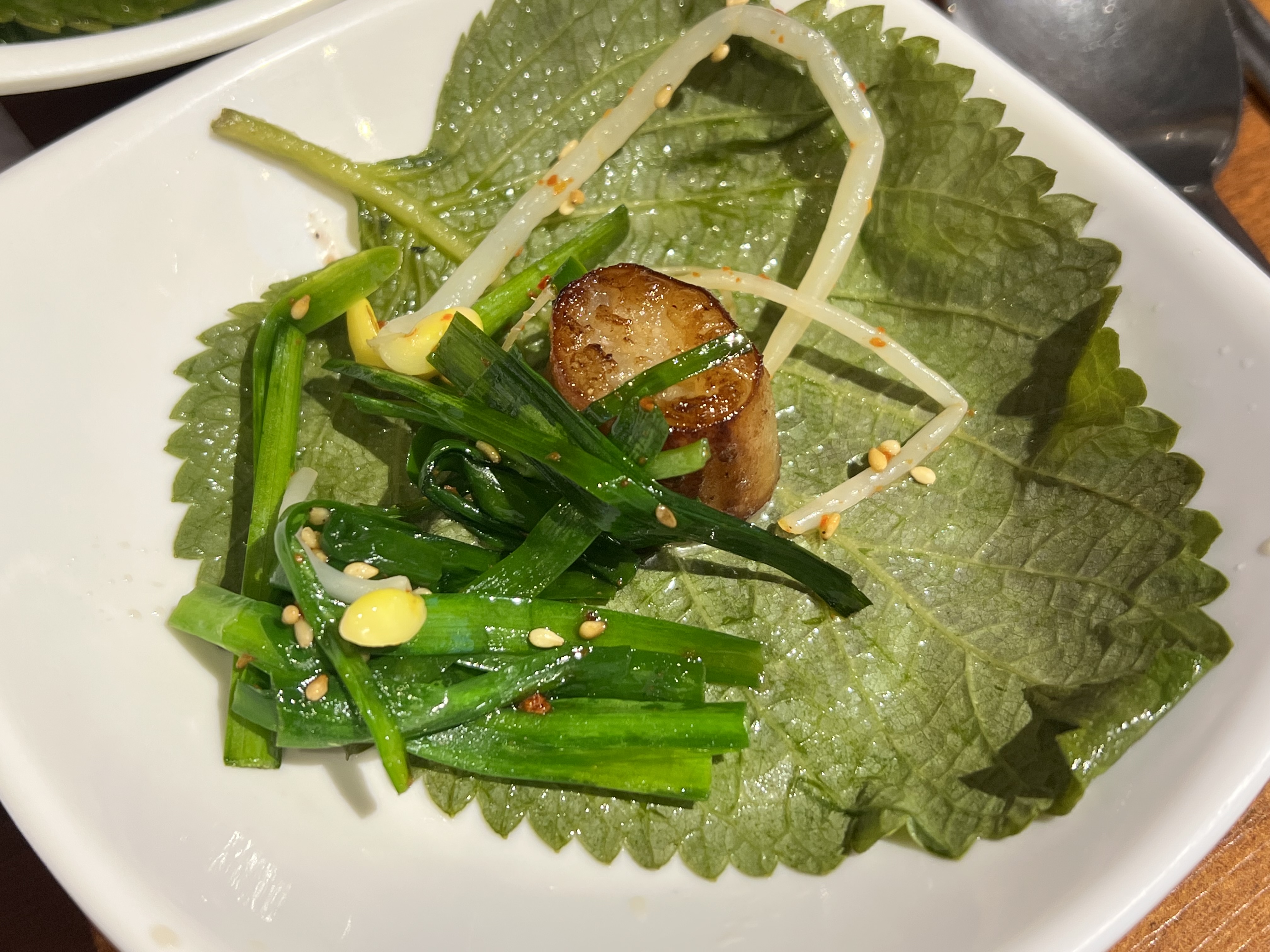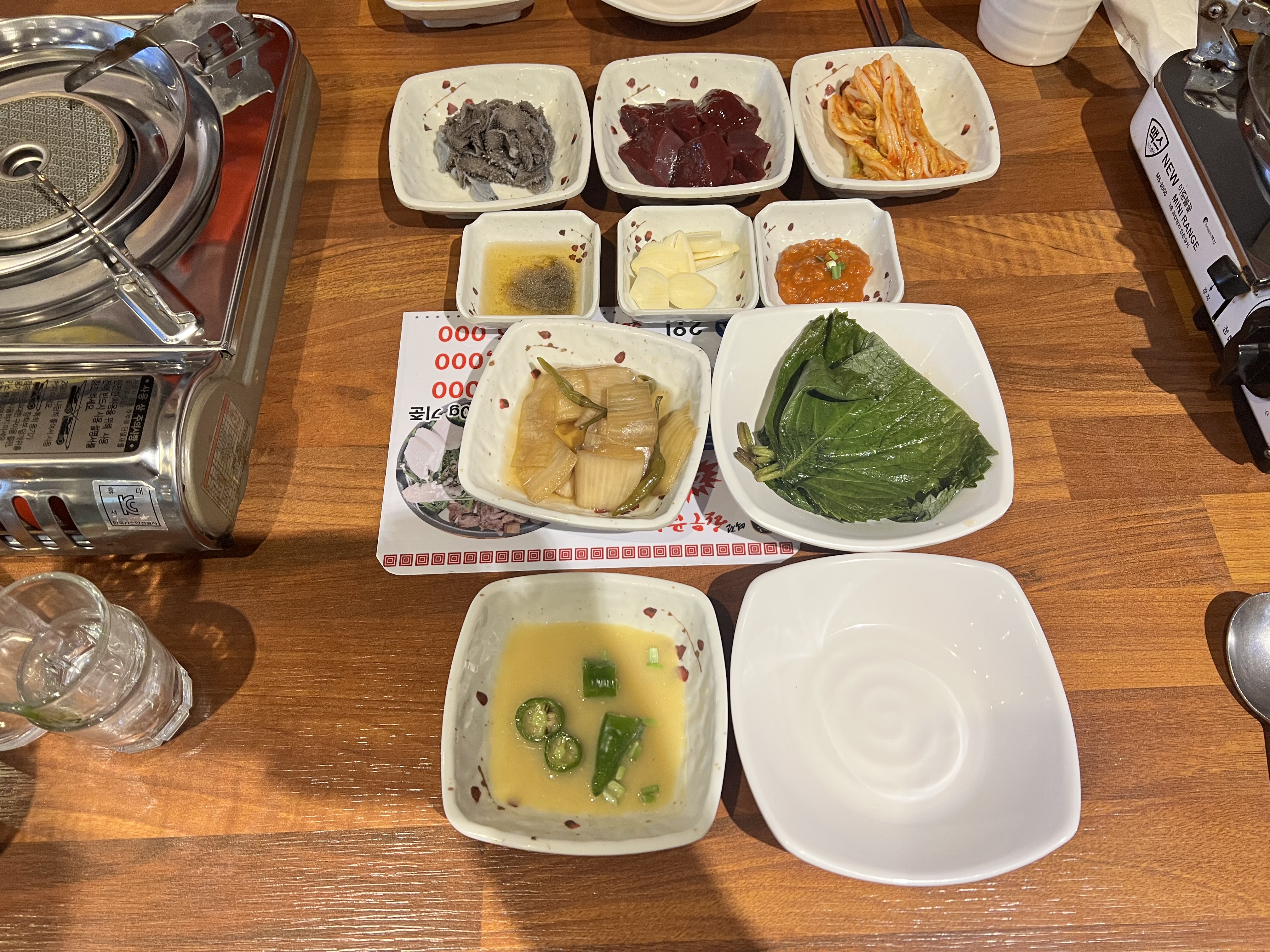 서비스 간, 천엽에 이어 김치, 깻잎, 양파절임, 기름장, 쌈장, 마늘, 특제 겨자소스가 제공됩니다.