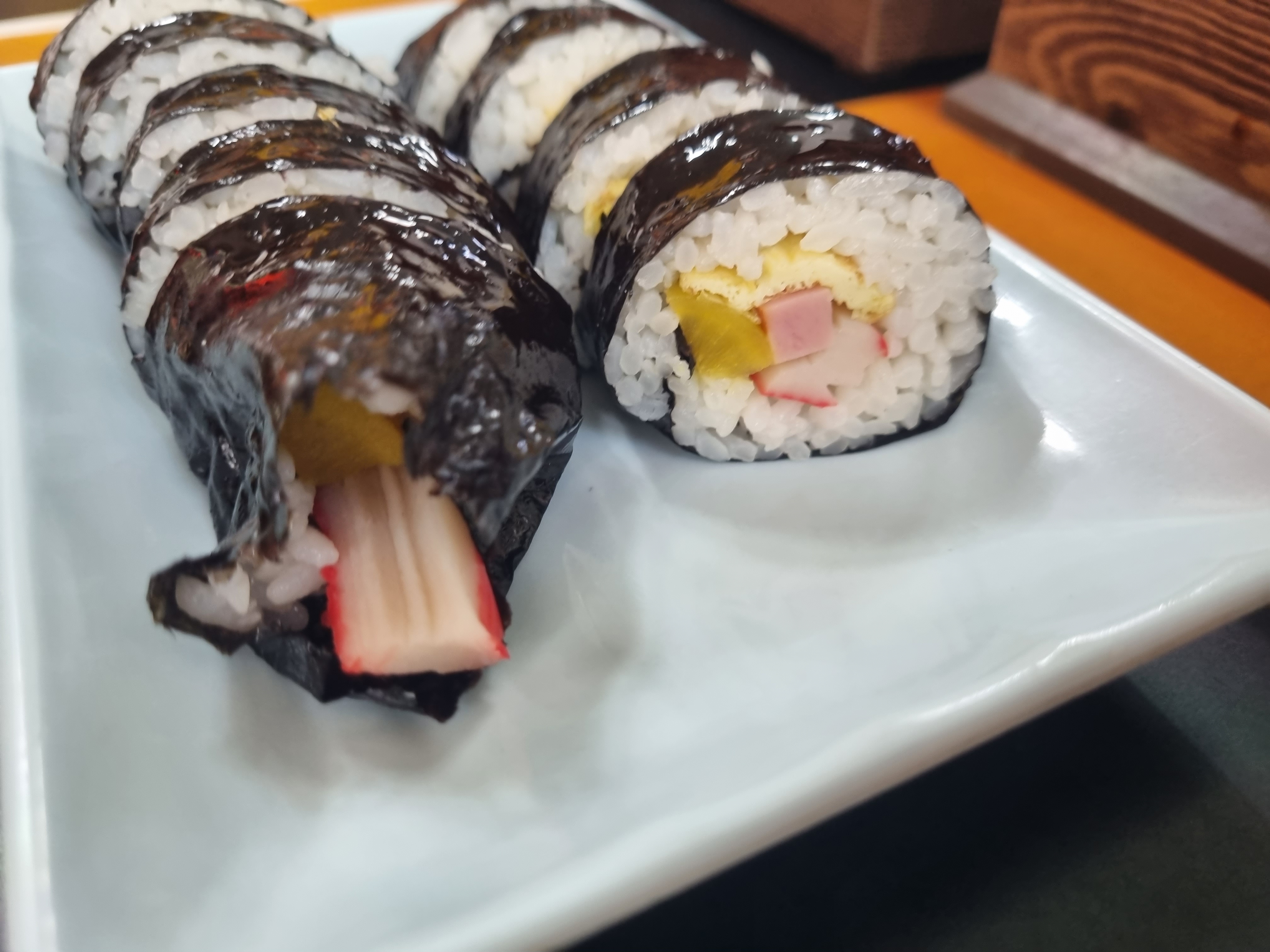 단무지, 김밥, 햄, 맛살, 계란 등의 기본 재료로 집에서 만든 김밥 같은 맛을 보여줍니다.