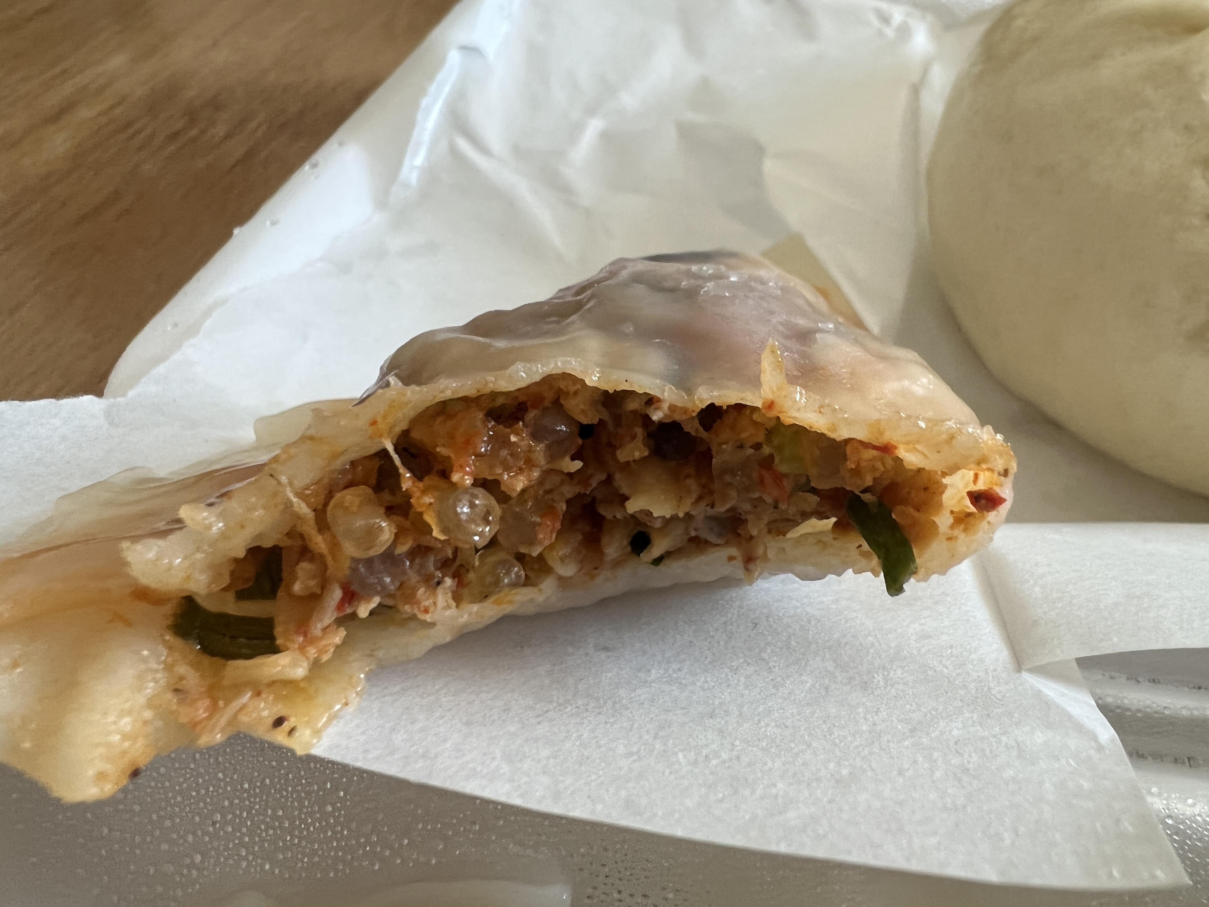 다음은 두꺼운 만두피를 가진 왕만두의 차례입니다. 아무래도 포장을해와서 인지 만두피가 좀 눅눅한 게 얇은피 만두만큼의 맛을 내지는 못합니다. 하지만 내용물은 가득 차 있고 고기도 모두 부드럽게 씹히고 김치만두도 깔끔하게 씹히는 식감을 보여줬습니다.
