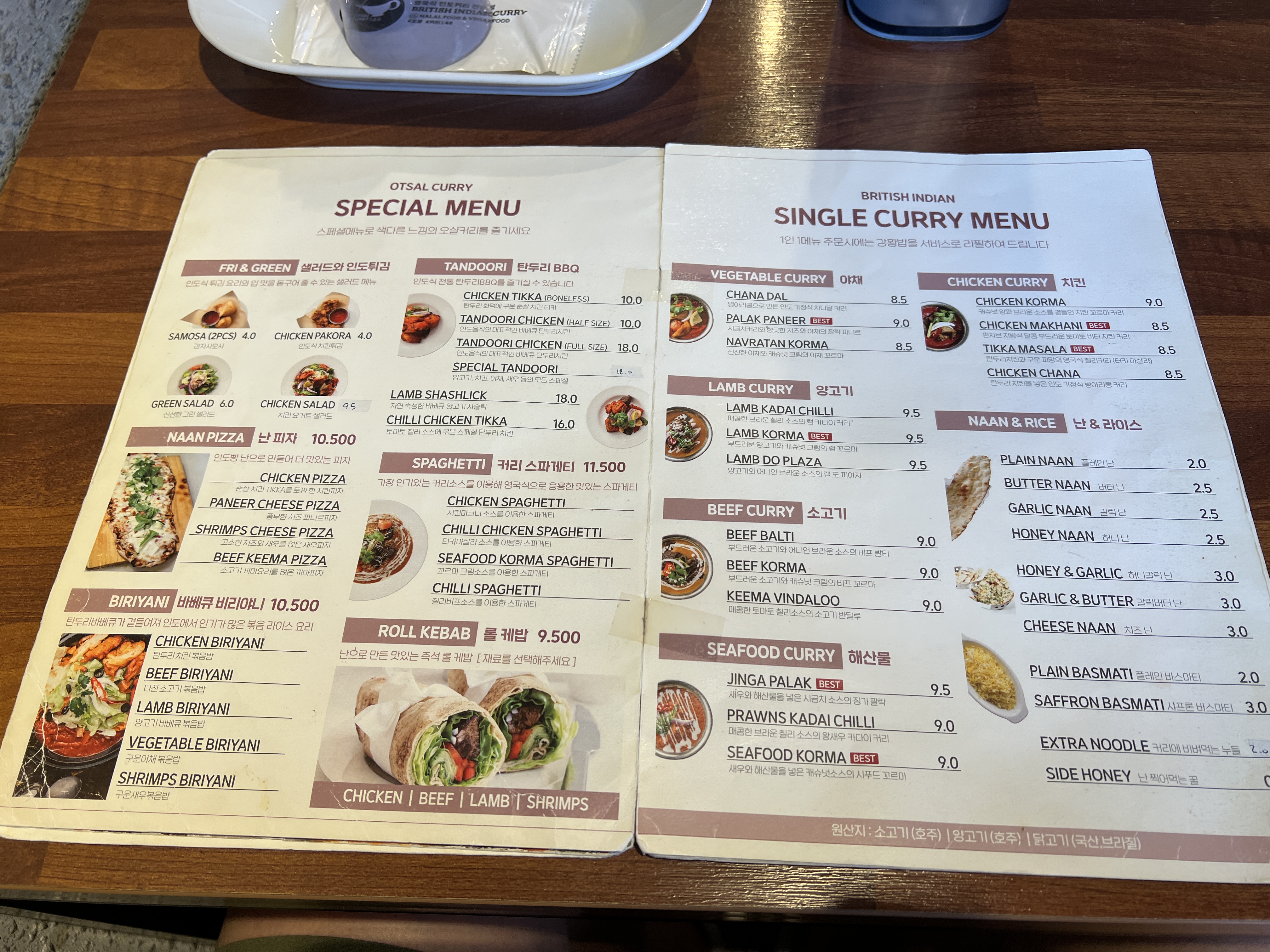 기본세트 메뉴(샐러드+커리1종+강황밥+기본난)에 탄두리 치킨 또는 탄두리 양고기가 추가되느냐에 따라 총 3종류의 세트메뉴를 선택할 수 있습니다.