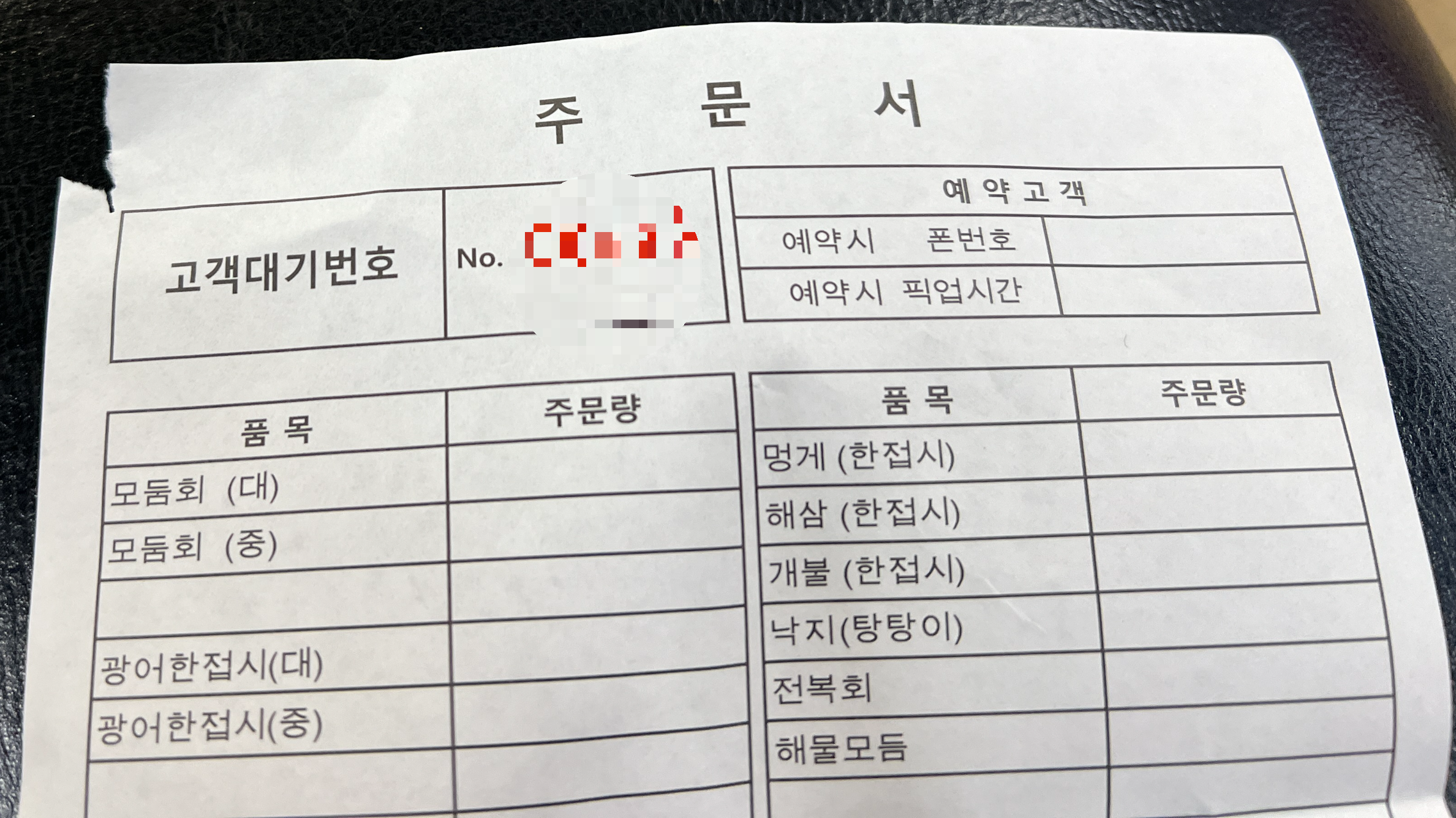 모둠회 중(34,000원)을 주문하고 결제를 하면 주문표를 주십니다.