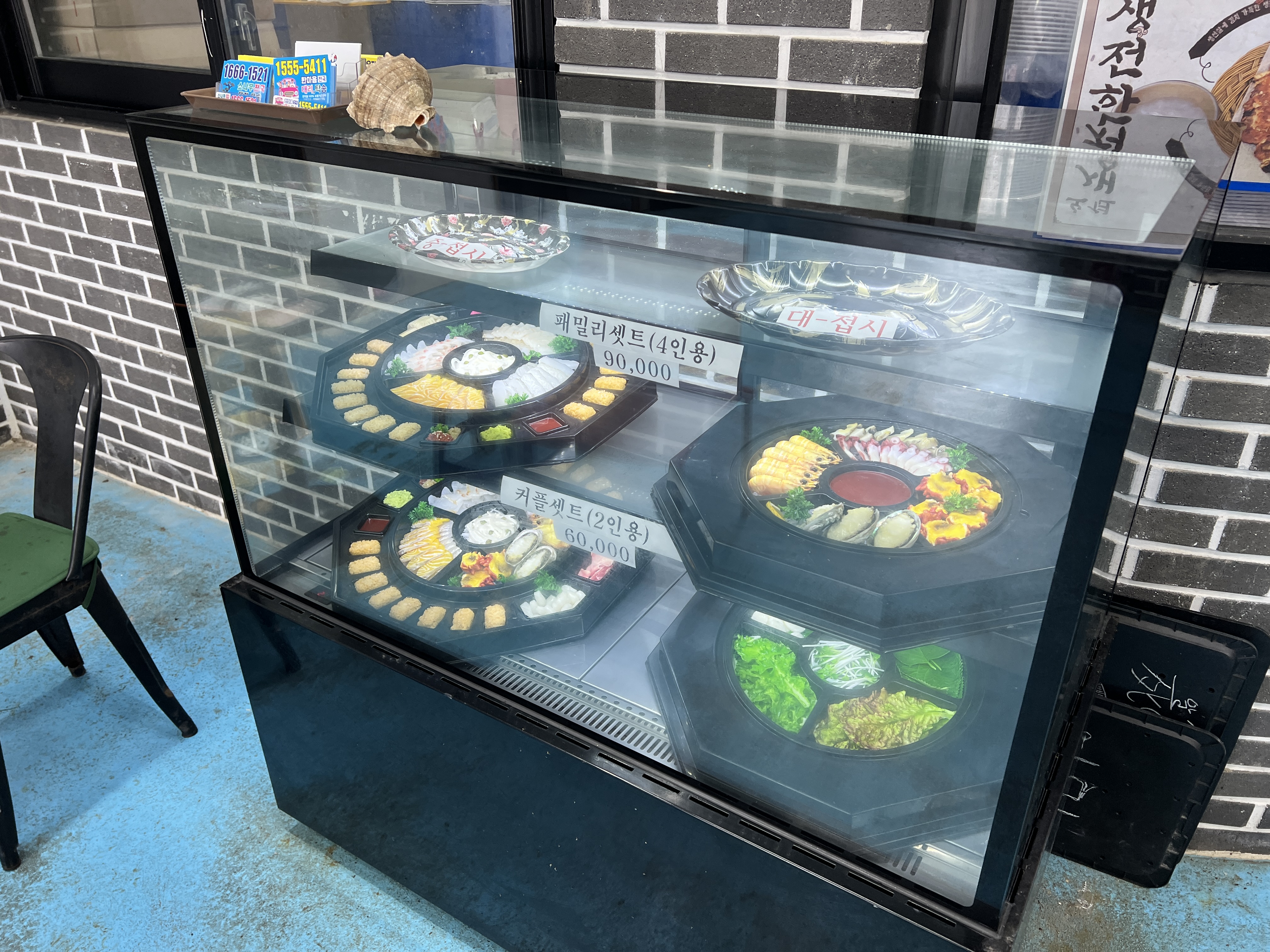 식당으로 입장하면 회(중/대) 양을 가늠할 수 있는 접시가 있고 인기메뉴인지 오션프렌즈에서 홍보하는 메뉴인지 패밀리세트(4인용-90,000원), 커플세트(2인용-60,000원) 모형이 있네요.
