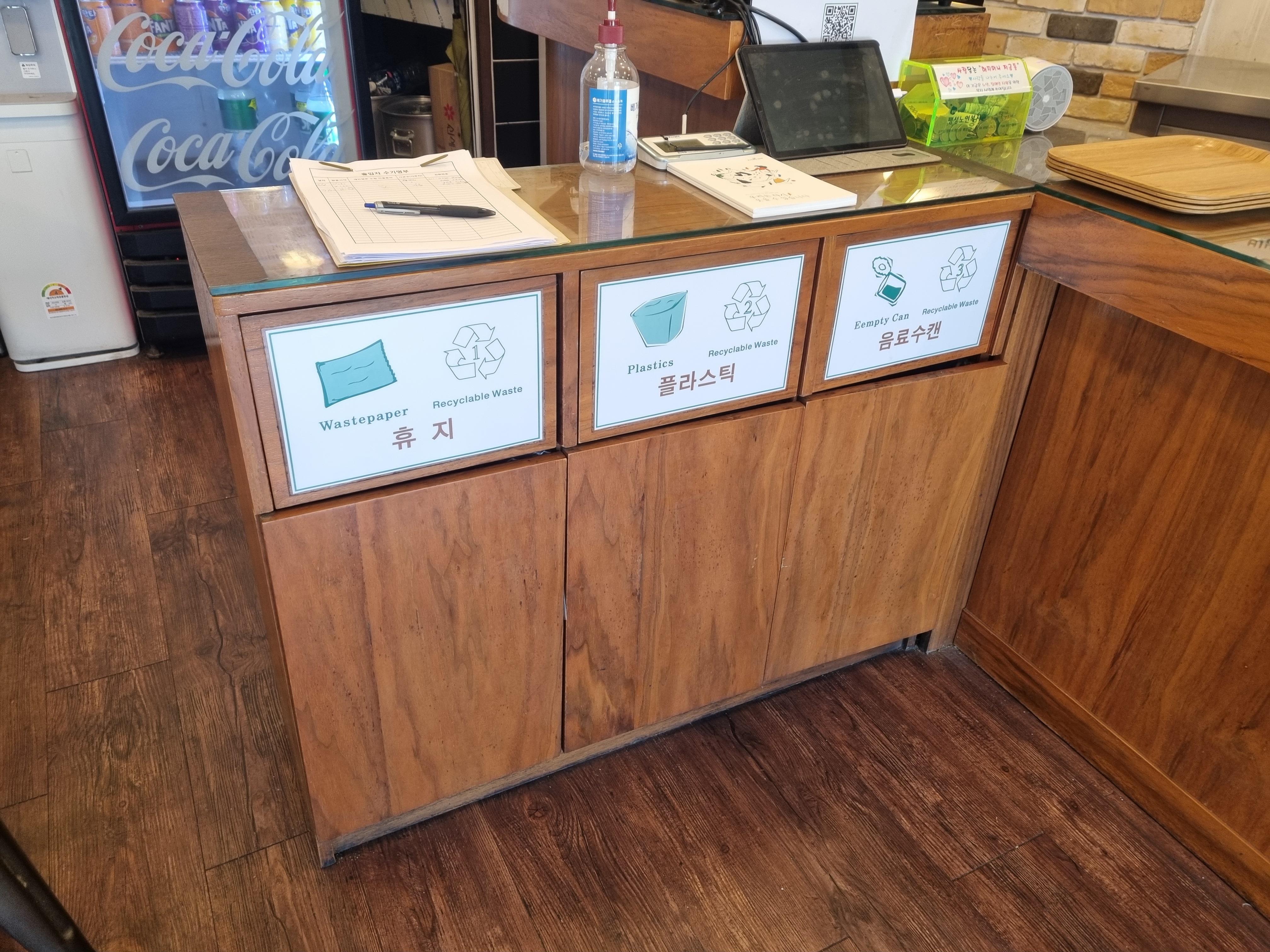 그리고 음료캔과 나머지 휴지를 분리하여 버리신 후 쟁반은 위 사진의 컵 왼쪽에 보이는 쟁반쌓여있는 곳에 놓으시면 됩니다.