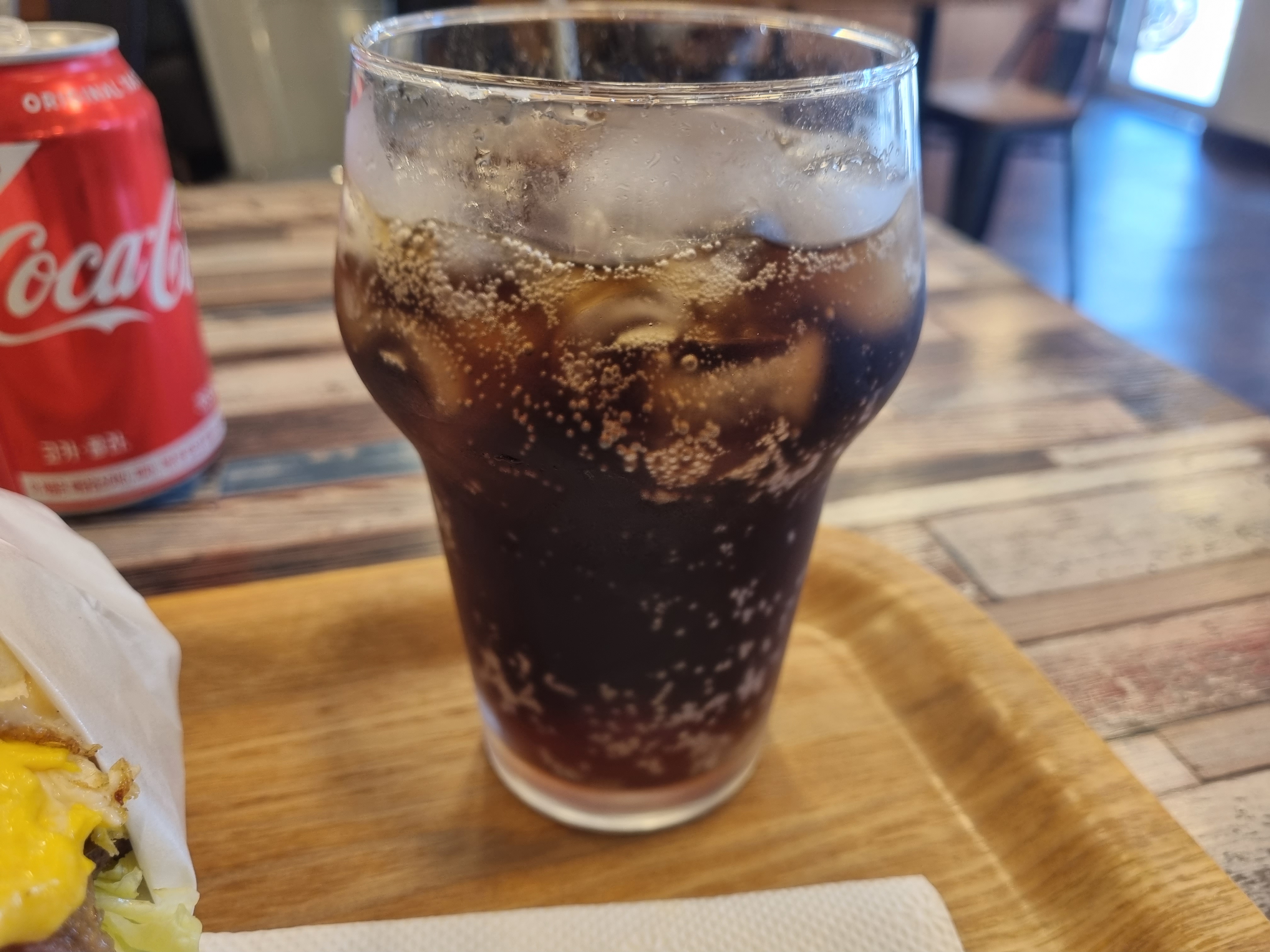 음료는 캔으로 제공되며 얼음이 담긴 컵을 주셔서 시간이 지나도 시원~~한 콜라를 마실 수 있습니다.