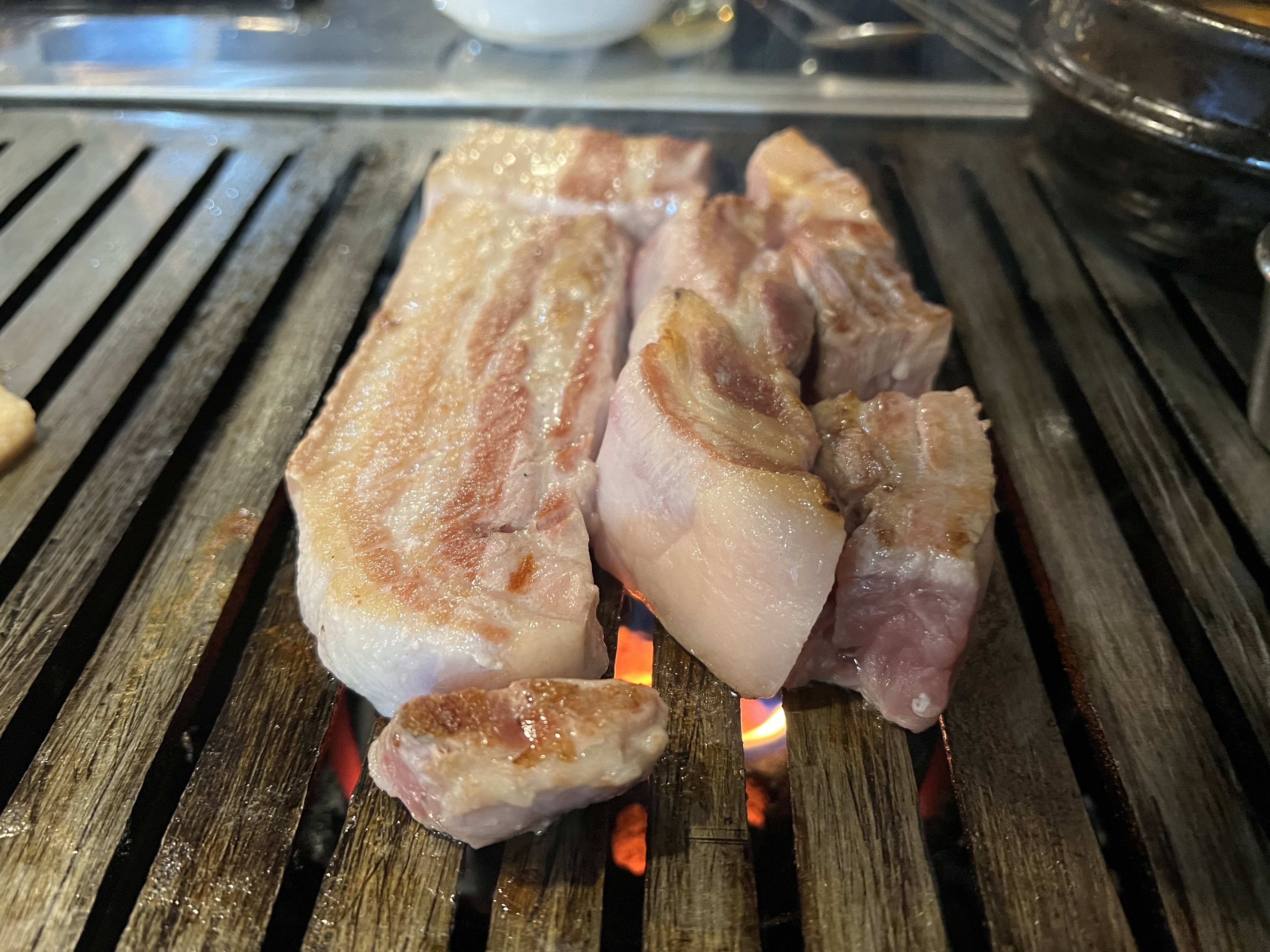 드디어 고기가 나왔습니다. 생오겹살과 왕주먹을 올려주십니다. 고기가 양도 많고 맛도 있어보이네요.