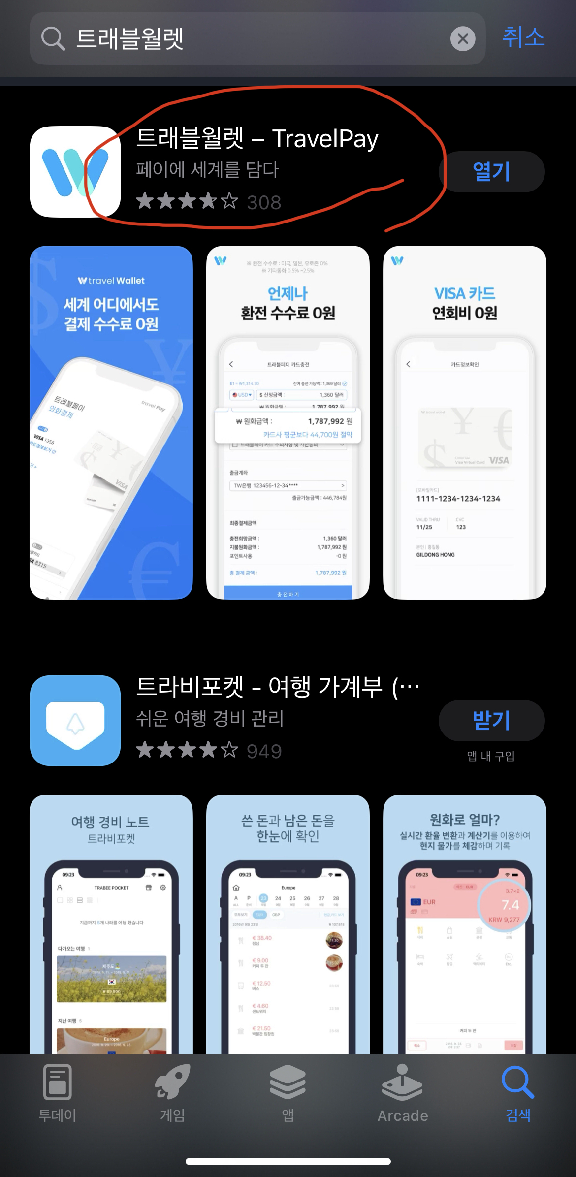 1. 먼저 트래블월렛 어플을 다운 받아줍니다.(아이폰 기준으로 설명하나 안드로이드도 절차는 비슷할 듯합니다.)