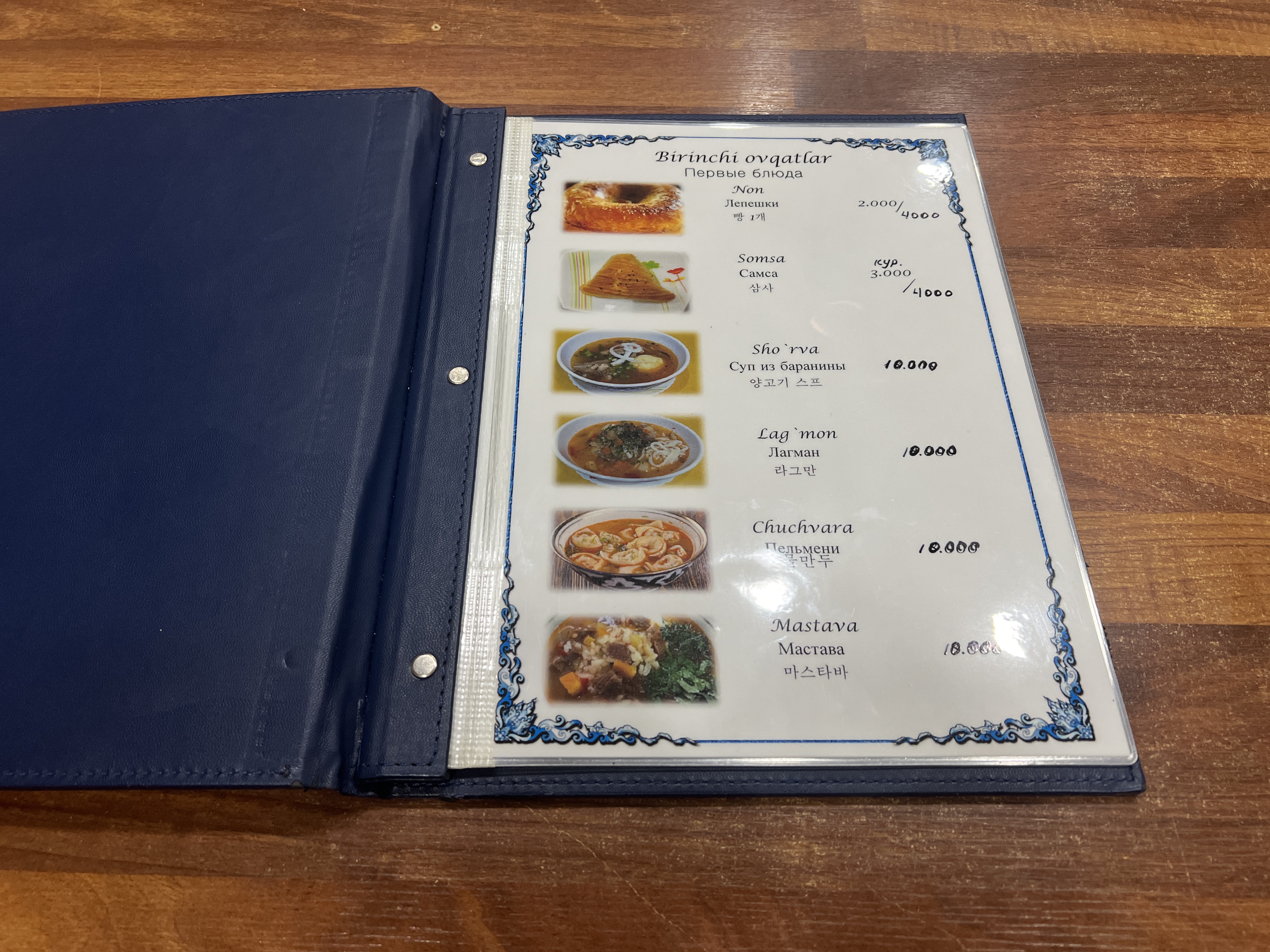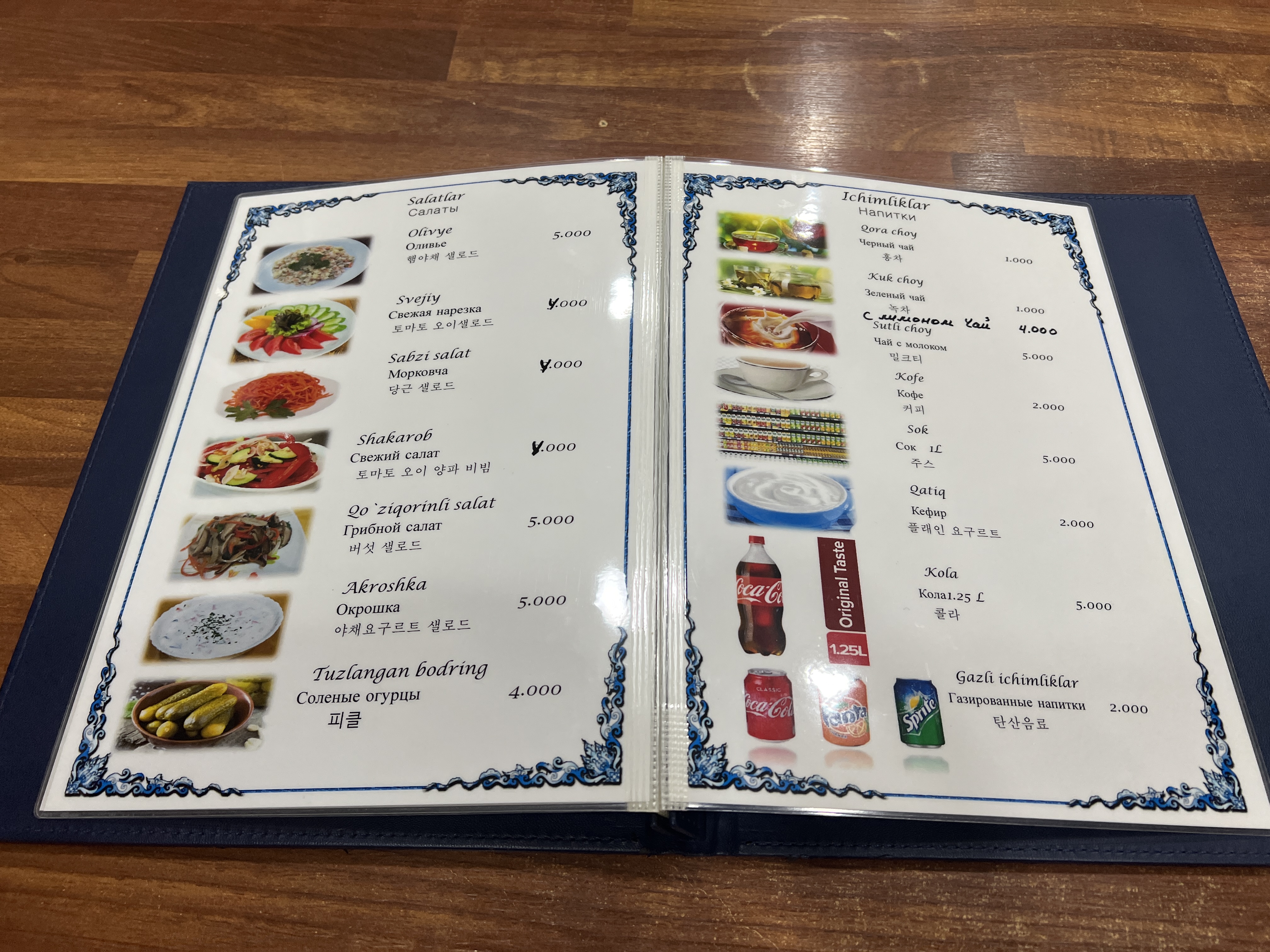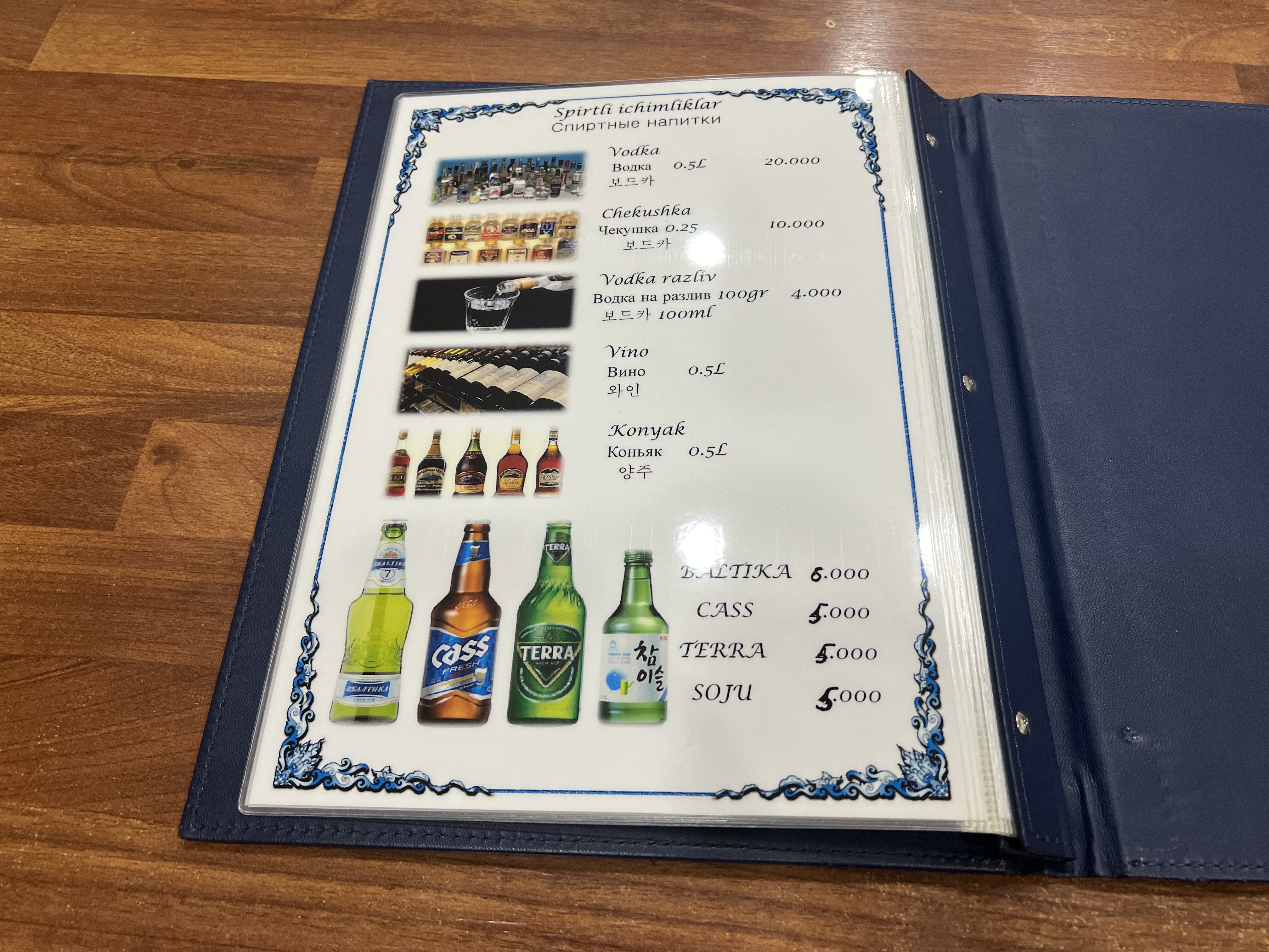 이제 가장 중요한 메뉴를 살펴봐야겠죠? 우즈베키스탄/러시아 음식 맛집인 워디(VODIY)에서는 대부분의 현지 음식을 맛볼 수 있었습니다. 라그만, 샤슬릭, 삼사 등등은 기본이고 다양한 메뉴들이 너무 많아서 선택장애 생기겠더라고요. 현지 주류까지 즐길 수 있습니다.