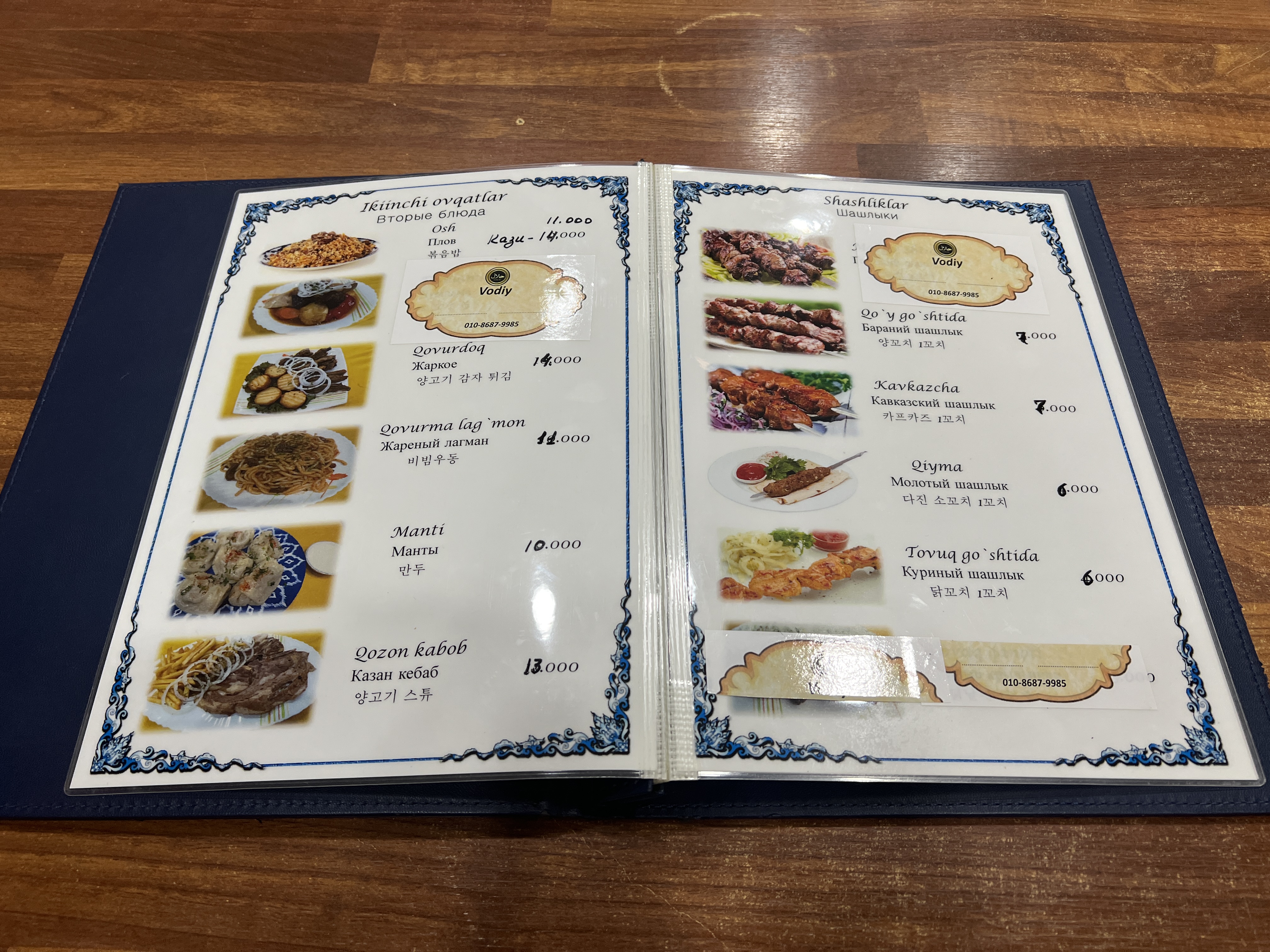 이제 가장 중요한 메뉴를 살펴봐야겠죠? 우즈베키스탄/러시아 음식 맛집인 워디(VODIY)에서는 대부분의 현지 음식을 맛볼 수 있었습니다. 라그만, 샤슬릭, 삼사 등등은 기본이고 다양한 메뉴들이 너무 많아서 선택장애 생기겠더라고요. 현지 주류까지 즐길 수 있습니다.