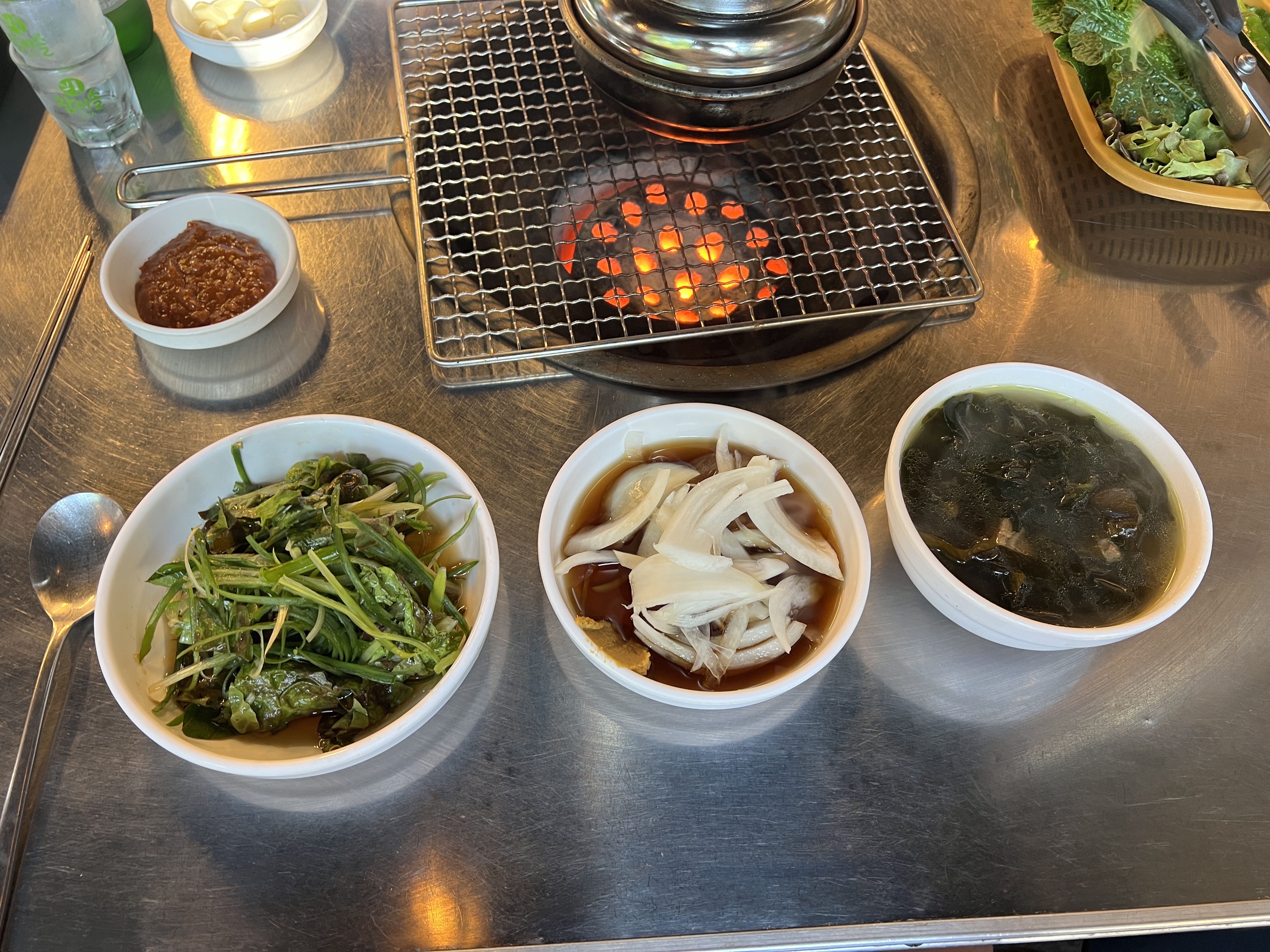 기본찬은 야채, 양파절임, 상추 파무침, 마늘, 쌈장 그리고 미역국이 나왔습니다. 웨이팅이 긴 것 치고는 반찬이 평범한 것 같아서 아쉬워하며 미역국을 한 수저 먹었는데 와!! 오래 푹 끓여 진한 맛이 우러나와 너무 맛있었습니다. 미역국만으로 공기밥 한 그릇 뚝딱할 것 같습니다.