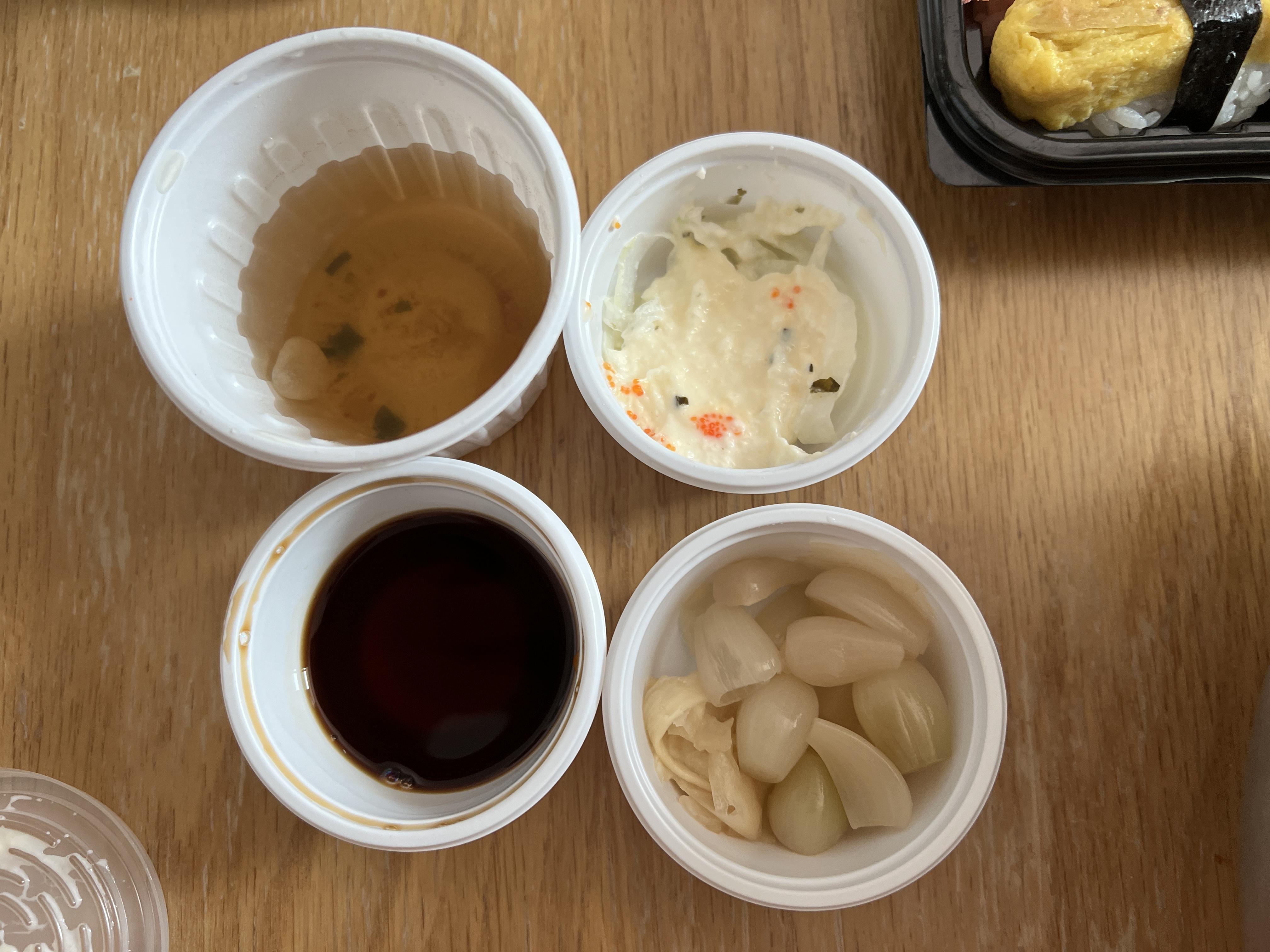 따뜻한 국물, 양파 샐러드?, 락교, 생강, 간장을 제공하여 줍니다.