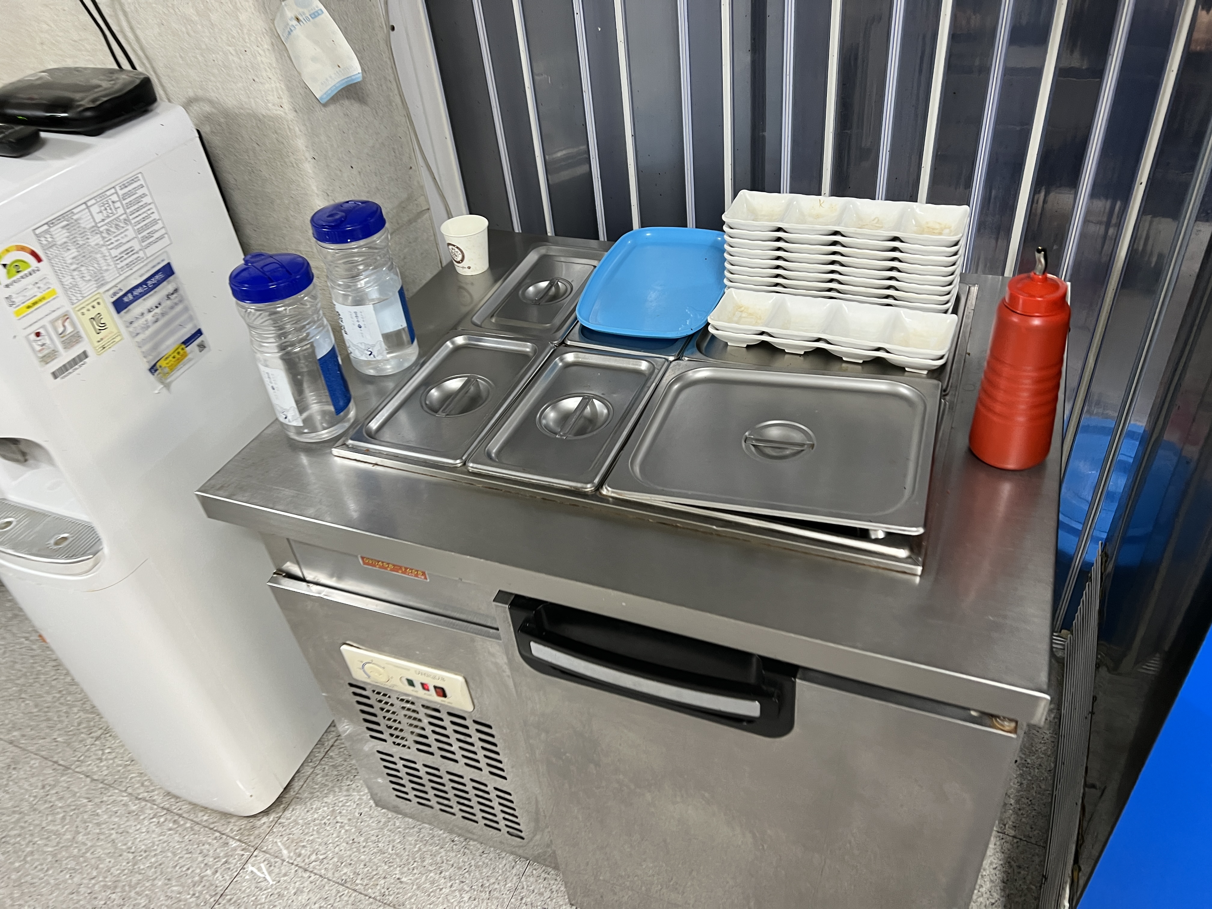 이곳은 특이하게 물, 반찬이 모두 셀프입니다. 들어가면 셀프바에가서 접시를 챙겨서 단무지, 양파, 김치를 먹고 싶은 대로 가져오면 됩니다. 물은 셀프바 옆에 정수기에서 떠먹으면 됩니다. 별도 컵이 없어서 냉장고 위에 있는 종이컵을 직접 찾아서 물을 마셨습니다. 배달에 집중하기 때문에 홀은 크게 신경을 안 쓰는 것 같습니다. 개인적으로는 이런 분위기를 좋아하기 때문에 저는 좋았지만 손님은 왕이라는 생각을 가진 분들은 큰 실망을 하실 것 같습니다.