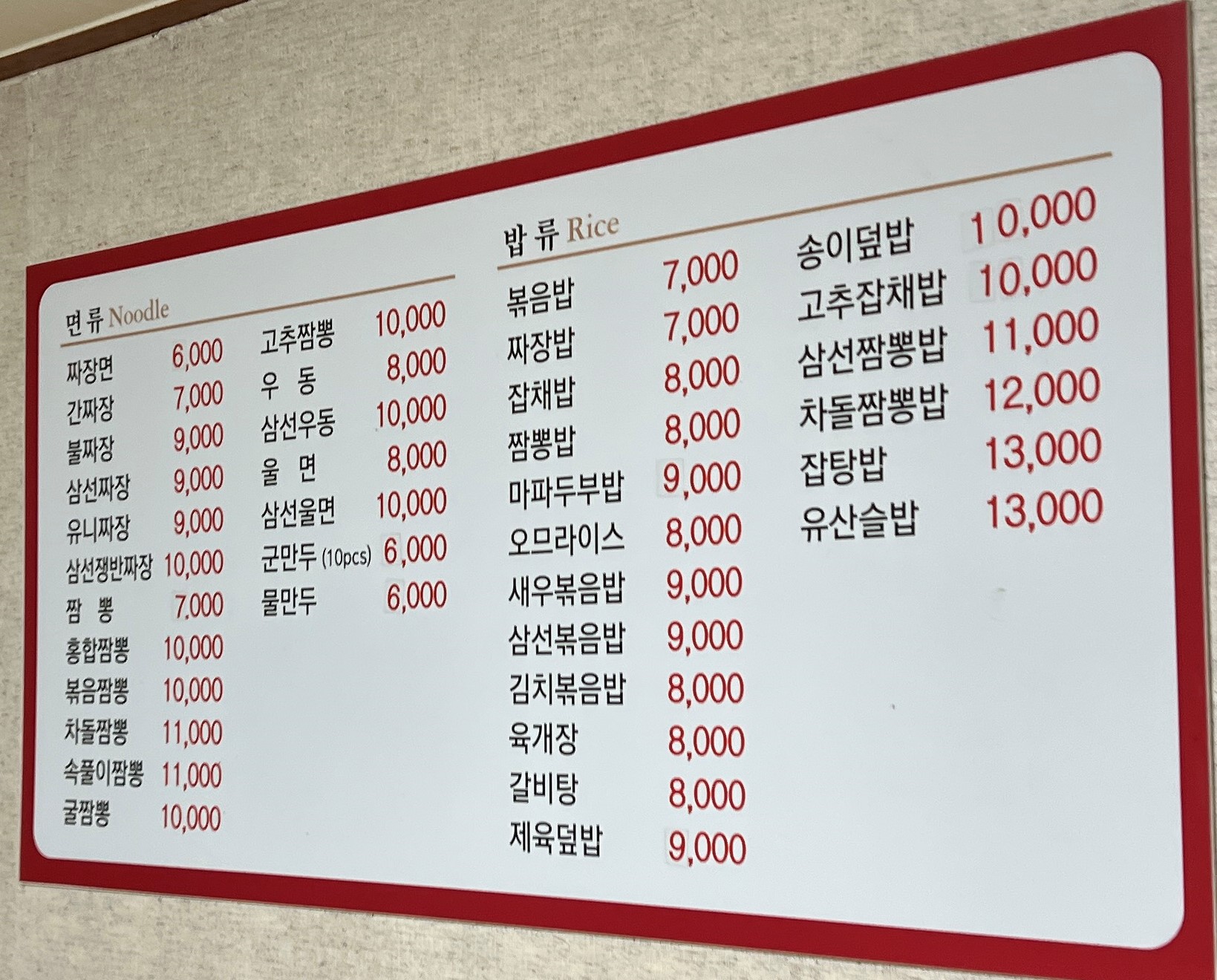 메뉴판을 보니 짜장면, 짬뽕은 기본이고 짬짜면, 탕짜면, 탕짬면 등등 식사 메뉴가 정말 다양하게 있습니다. 그런 다양하게 있는 메뉴를 찍지 못하고 기본 메뉴만 나와있는 메뉴 사진을 찍어버렸습니다. ㅠㅠ 지금보니까 요리가격도 안 나와있는 메뉴판이네요. 이런 실수를... 전체적으로 가격은 비싸지도, 싸지도 않은 일반 중국집 가격입니다. 간짜장 곱빼기(8,000원)를 주문합니다.(참고로 미니탕수육은 10,000원입니다)
