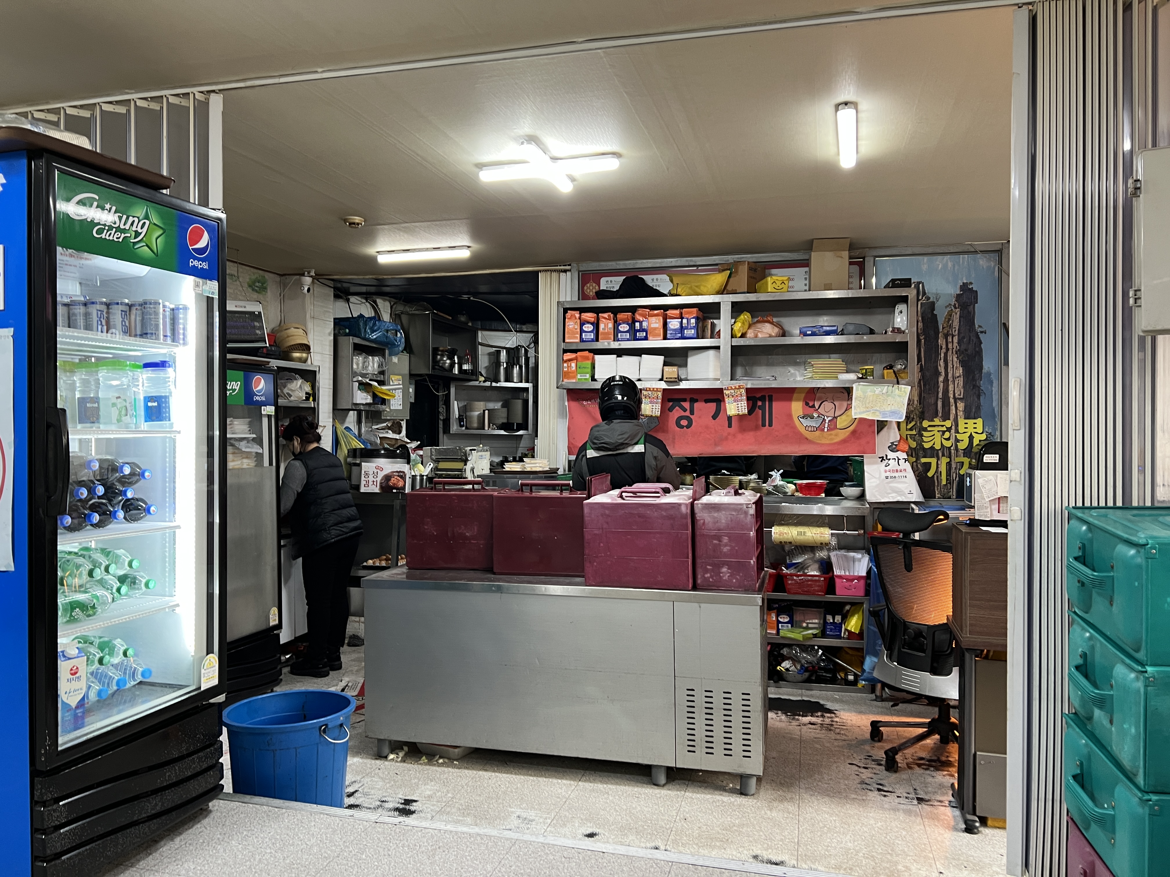 문을 열자마자 줄지어있는 배달통들이 인기를 실감할 수 있었습니다. 직원분들은 대부분 중국어로 소통을 하셨고 내부는 청결하였지만 뭔가 배달에 특화되어 있는 집기 배치를 볼 수 있었습니다. 빠른 배달을 위해 배달통이 정문 앞에 있고 테이블은 4인 테이블이 4개 있습니다. 배달용 단무지, 음료 등을 꺼내기 쉽게 정문 쪽을 보고 배치되어 있습니다.