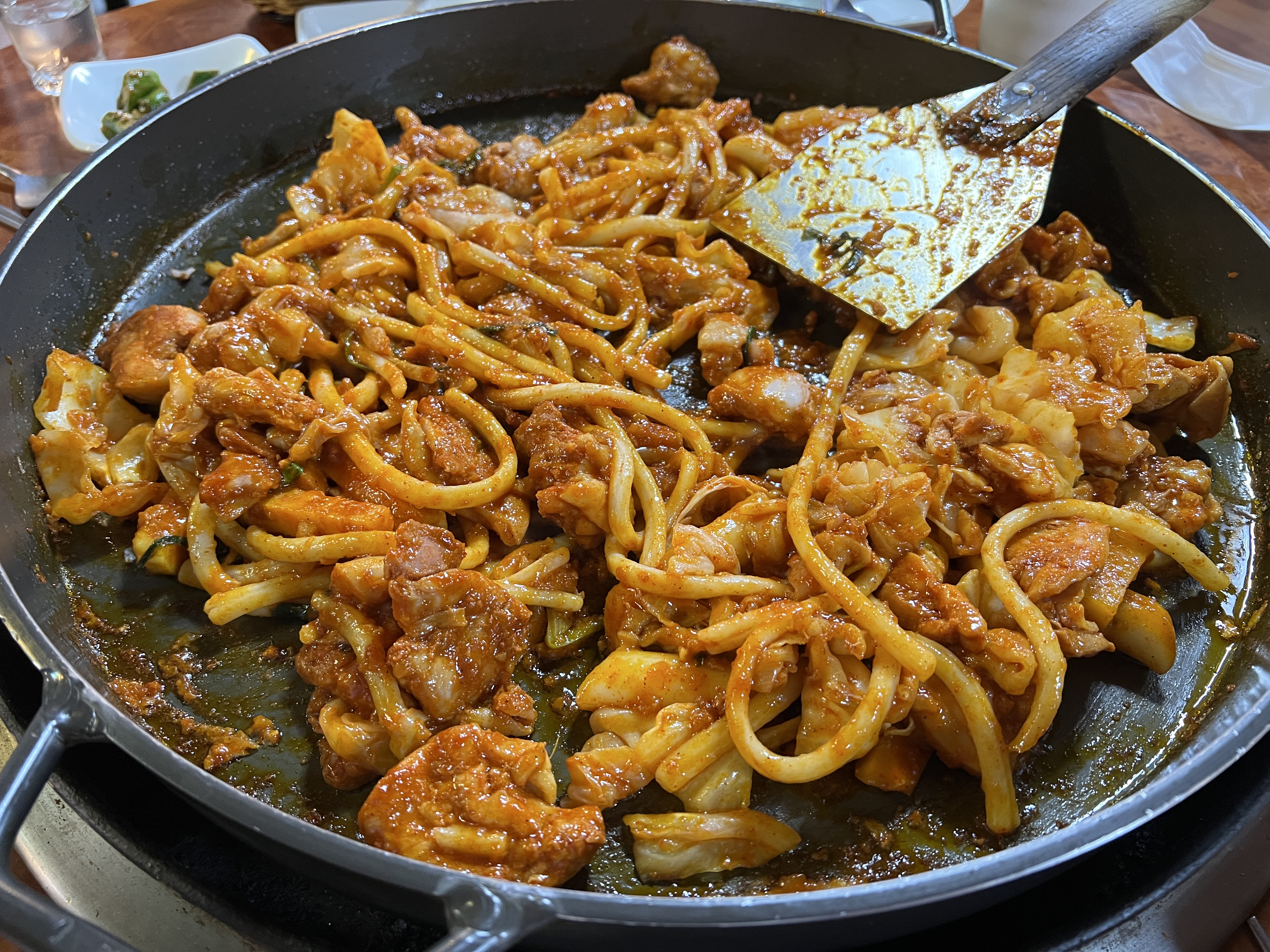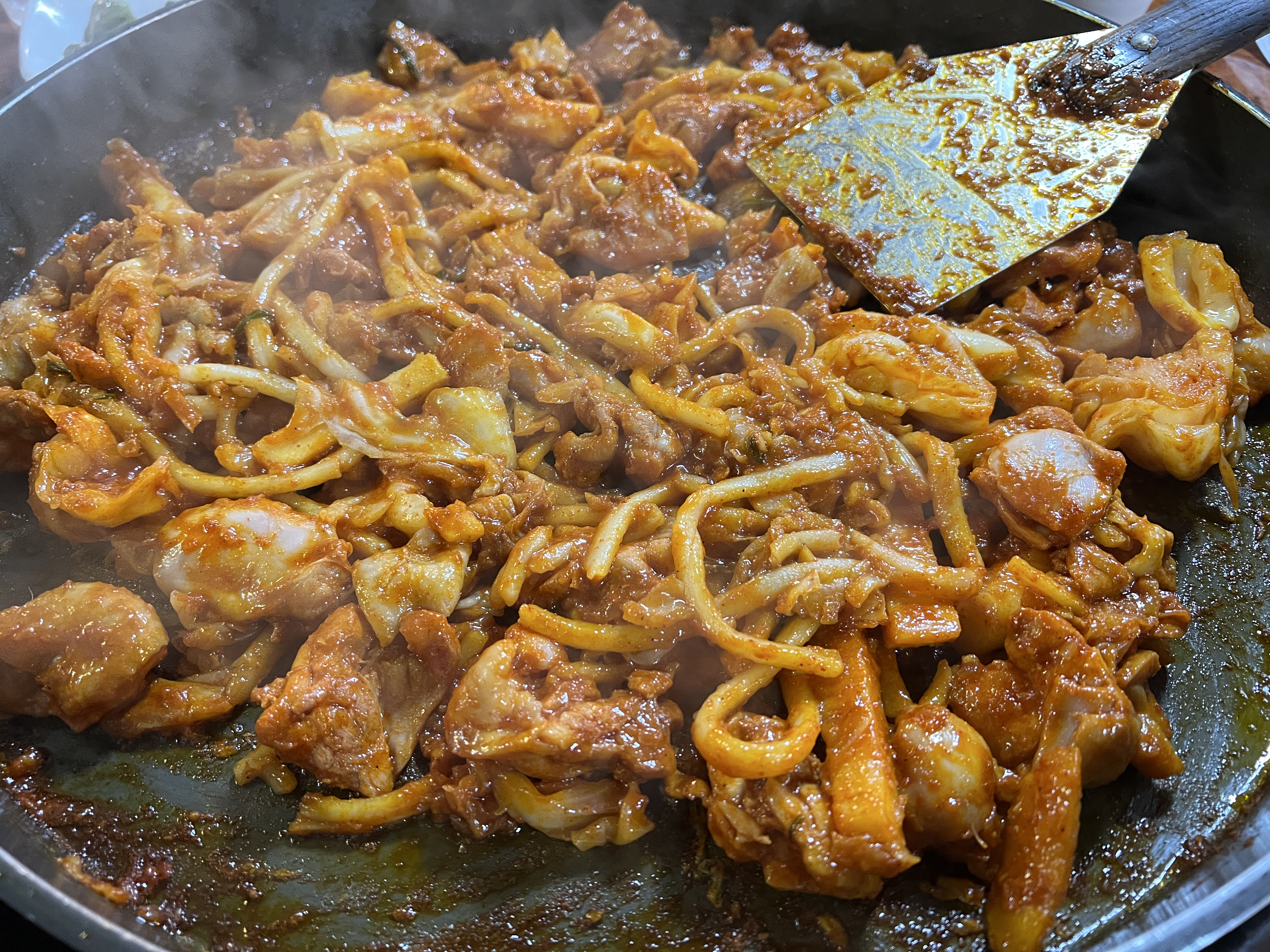닭갈비가 어느 정도 익고 나면 우동사리를 넣어주십니다.