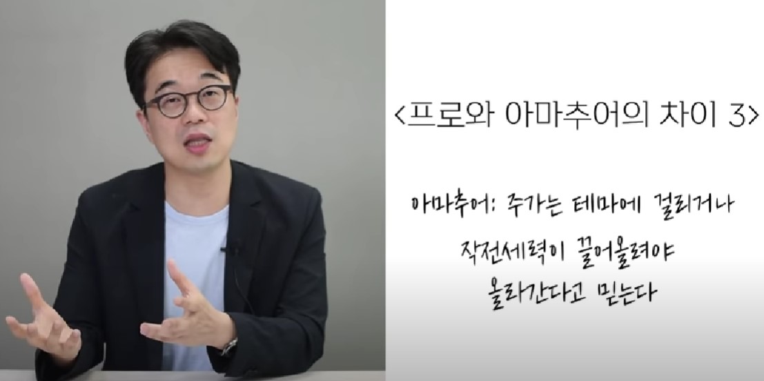 아마추어는 주가 상승의 요인을 엉뚱한데서 찾는 경향을 보인다는 것입니다. 하지만 아이러니하게도 어떤 종목이 테마에 걸릴지 그리고 작전세력이 작업을 해서 이걸 끌어올릴지 이것은 오히려 개인투자자들이 가장 모르는 영역입니다. 심지어 펀더멘탈을 좀 보는 그런 아마추어라고 하더라도 오류에 빠지는 게 기업 가치를 구성하는 요인 중에서 굉장히 작은 부분에서 발생하는 호재라든가 그리고 장래에 대한 기대감 이런 걸 갖고 투자를 하게 되는데 사실은 메인 사업이 주가에 미치는 영향력이 더 크다는 것입니다. 그런 오류를 범하는 것도 아마추어들이 흔히 하는 실수 중에 하나라고 합니다.