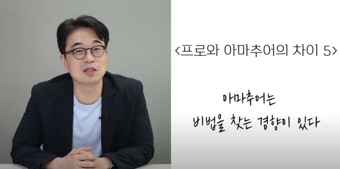 마지막 차이점은 "아마추어는 비법을 찾는 경향이 있다"는 것입니다. 프로들이 간단한 비법을 쓰기 때문에 그것만 알면 나도 그렇게 할 수 있는데 비법을 모른다라고 생각한다는 것입니다. 최준철 대표에게도 굉장히 간단하고 단순한 형태로 비법을 물어보는 분들이 많다고 합니다.
