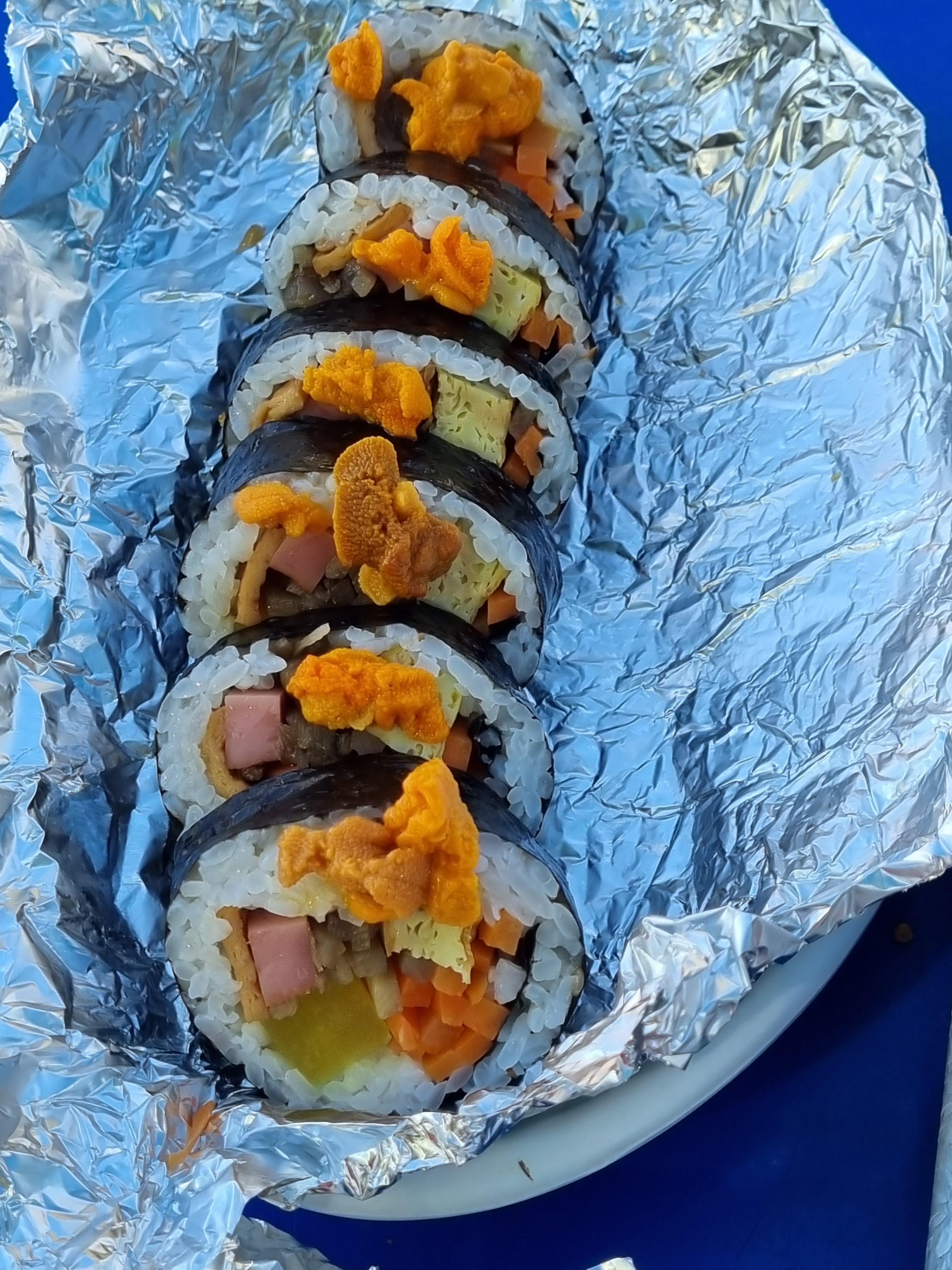 김밥에 성게알을 올려먹는 게 별미라 하여 먹어보았습니다.