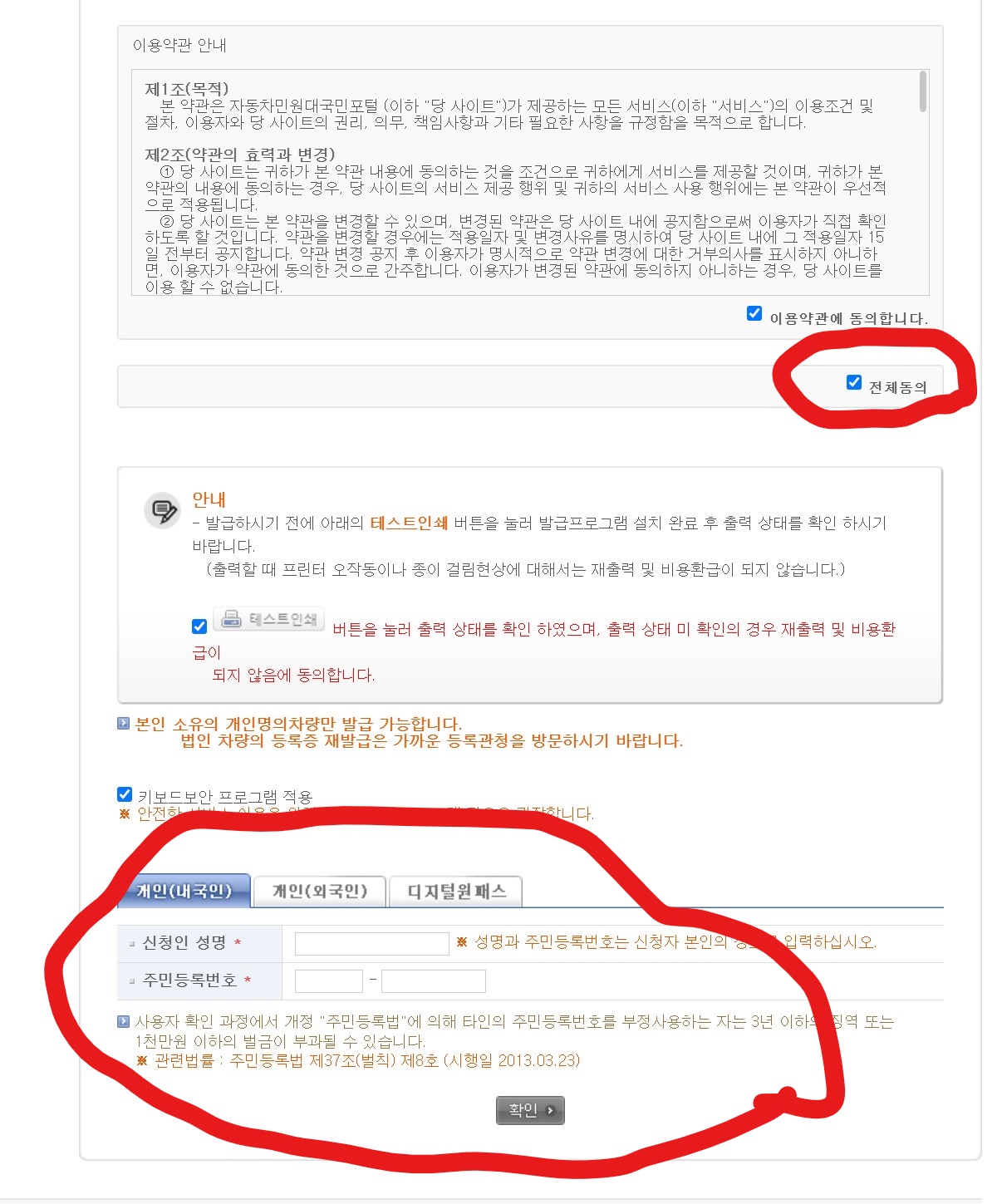 5. 사용자 확인 내용을 확인 후 "전체동의" 를 클릭 후 하단의 신청인 성명, 주민등록번호를 넣고 확인을 눌러줍니다.