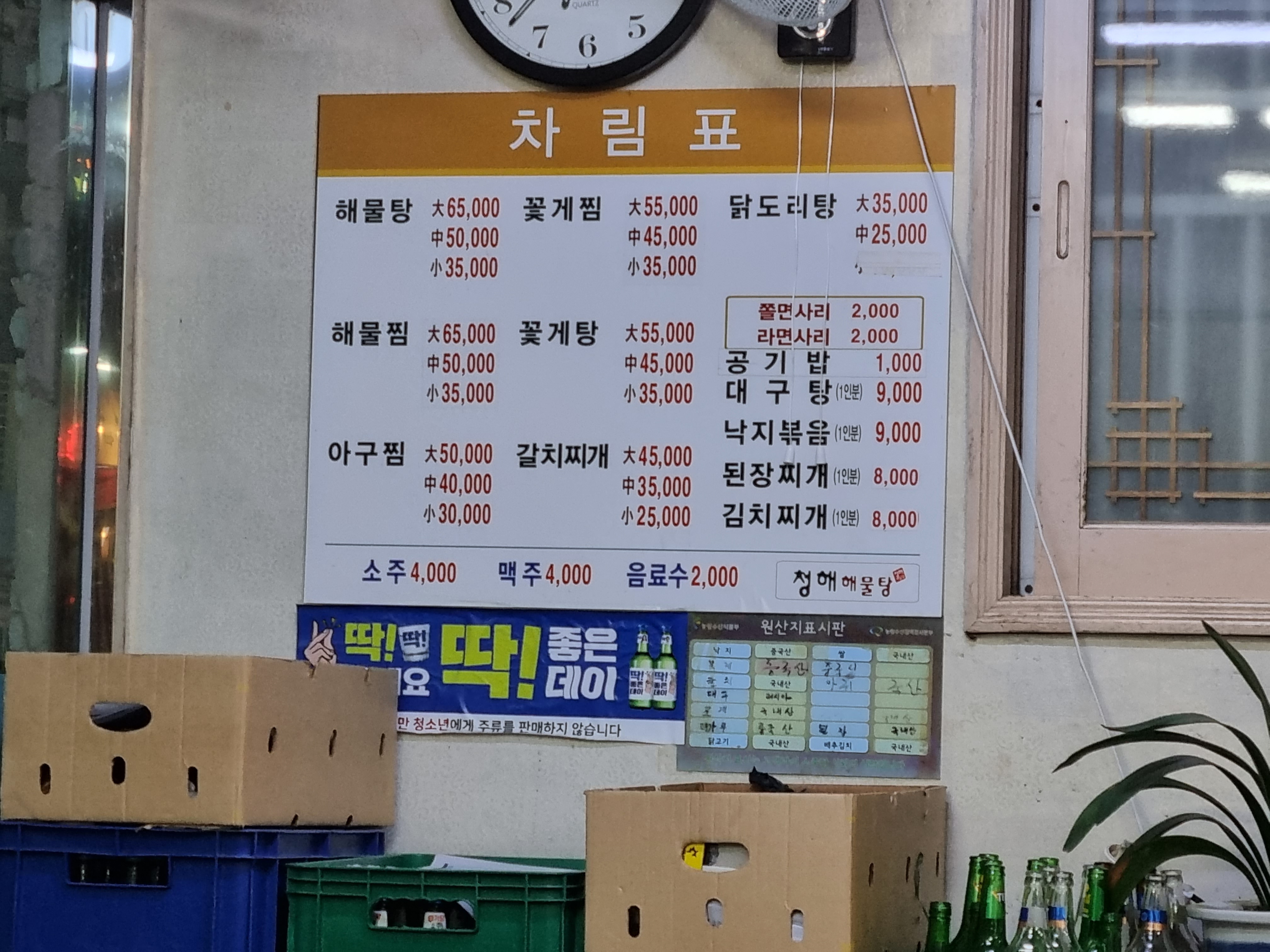 청해해물탕 기본 반찬을 맛보니 술을 안 시킬 수가 없었습니다.