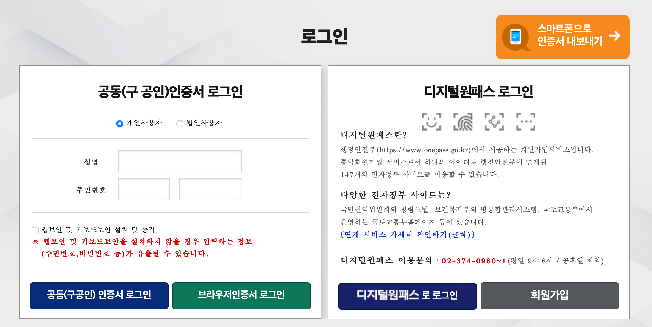 (핸드폰에 공동인증서 및 디지털원패스가 준비되어 있지 않으면 이용이 어렵습니다.)