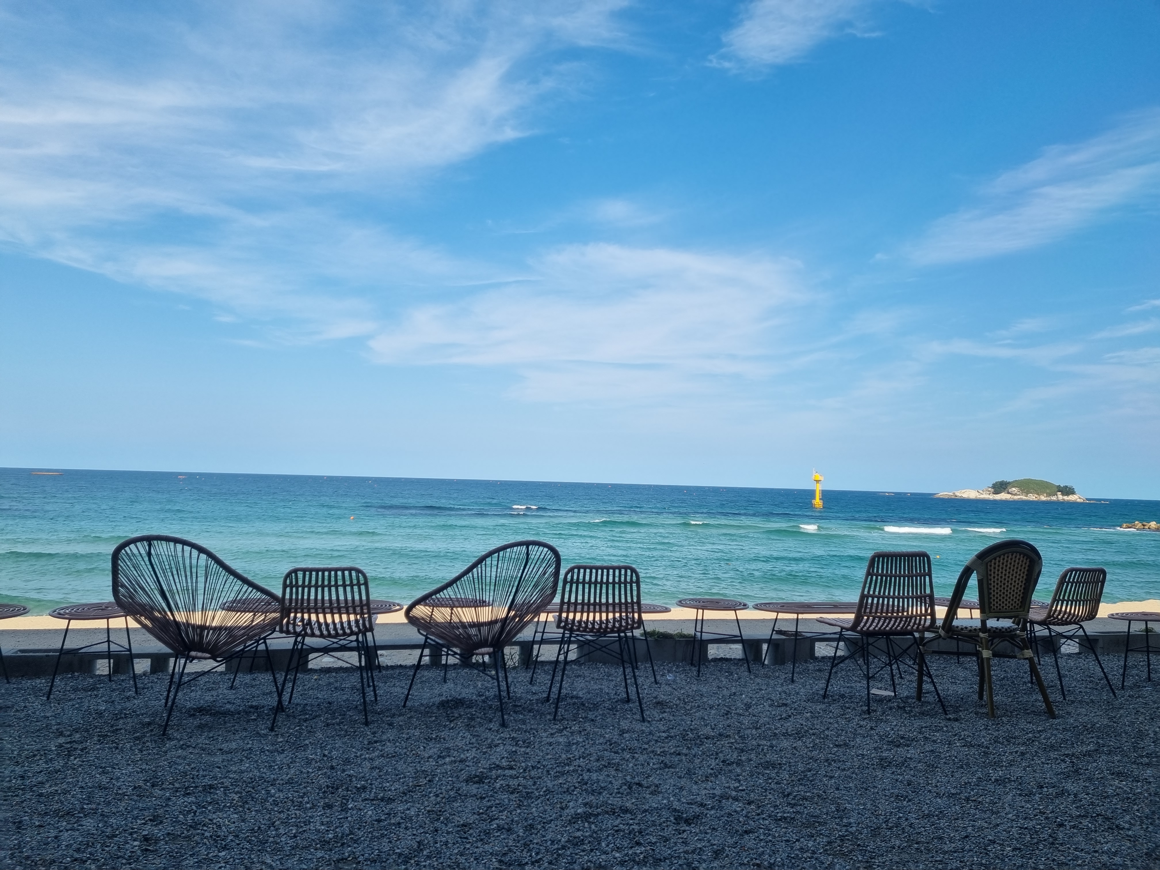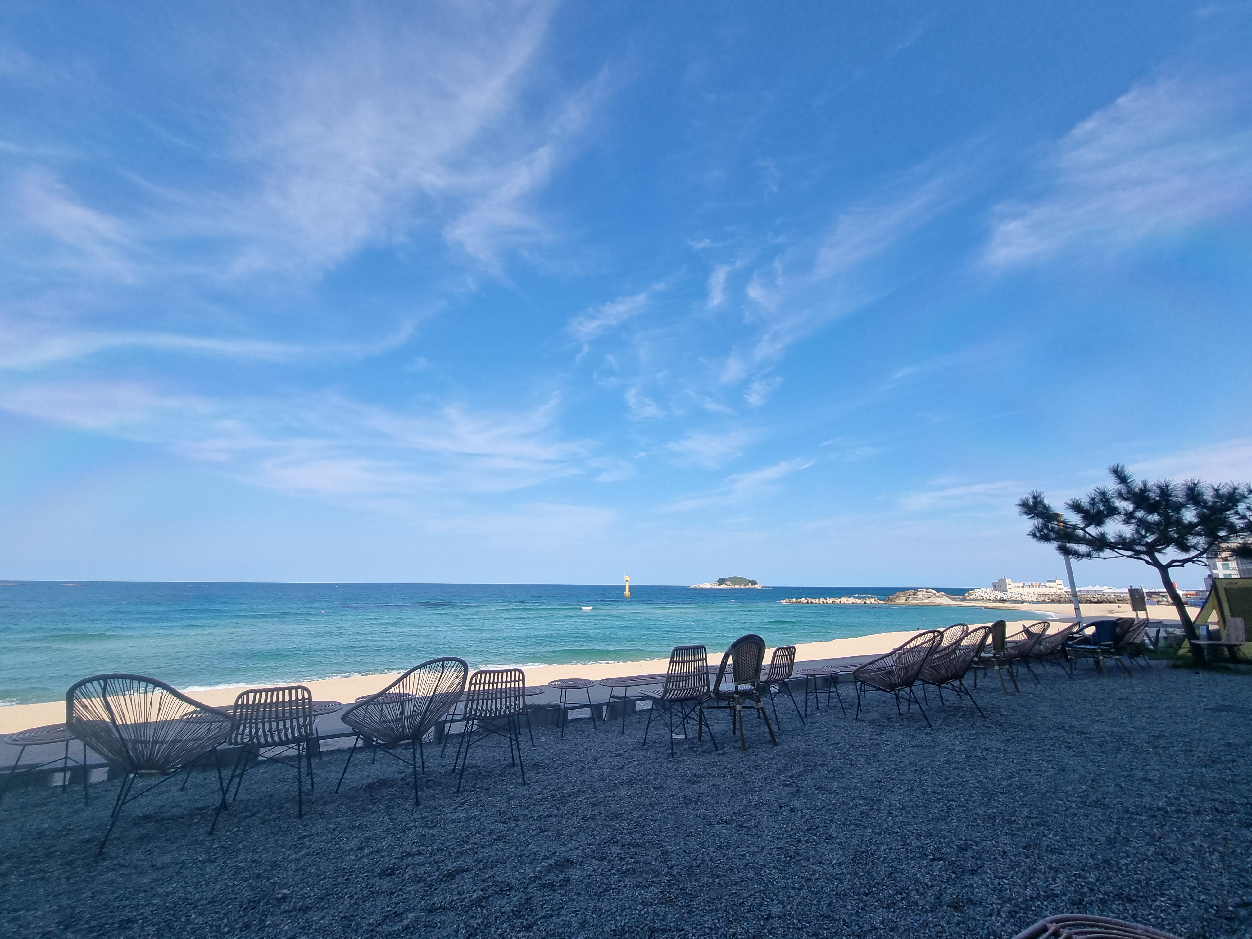 모래사장 위에 테이블과 의자가 있고 정말 푸르른 바다가 한눈에 들어오는 곳이었습니다.