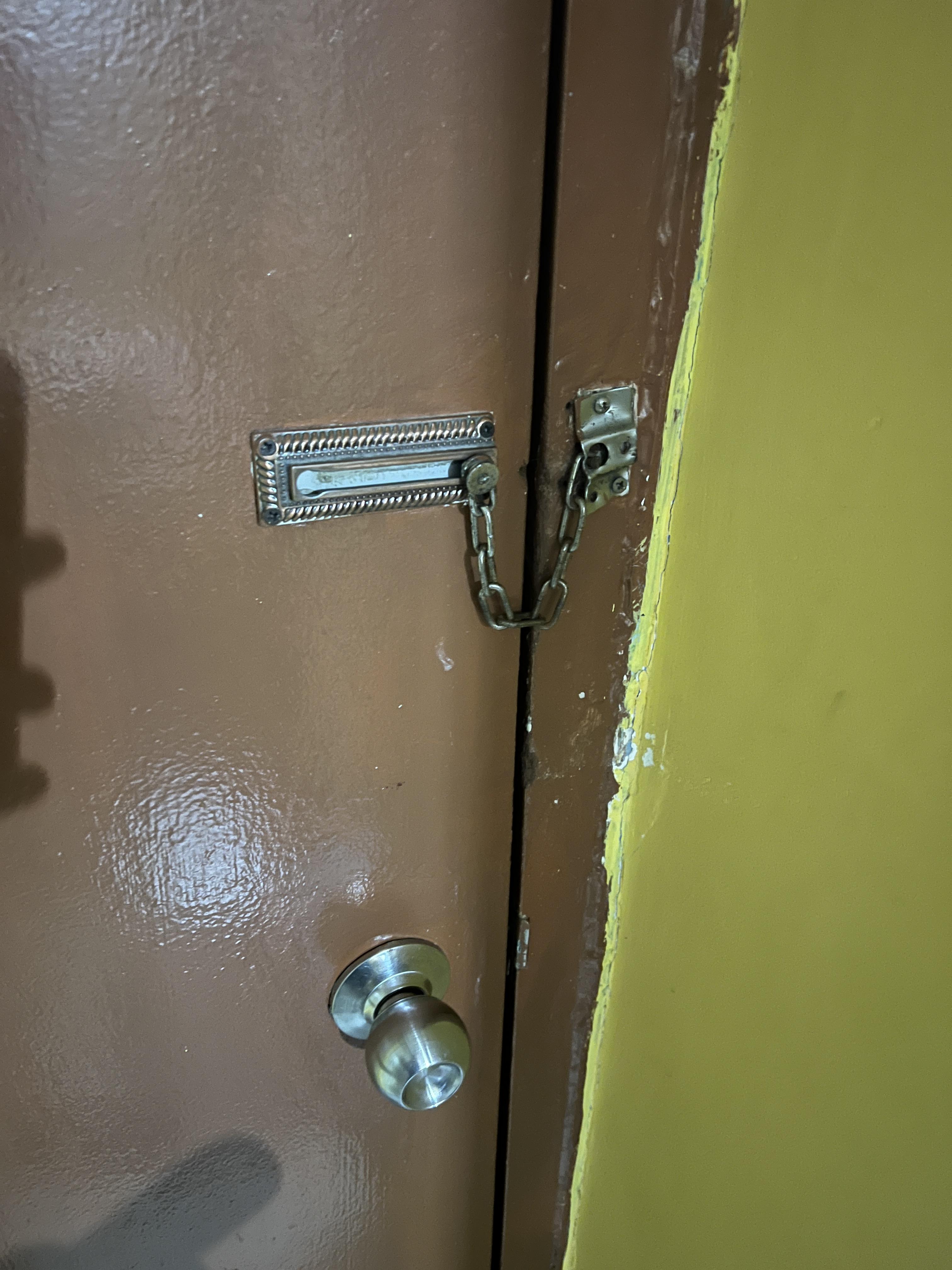 캐리어를 들고 계단을 올라가면 보기에도 음산한 나무색 문과 마주하게 됩니다. 캄캄한 저녁이라 그런지 더욱 무섭게 다가옵니다.