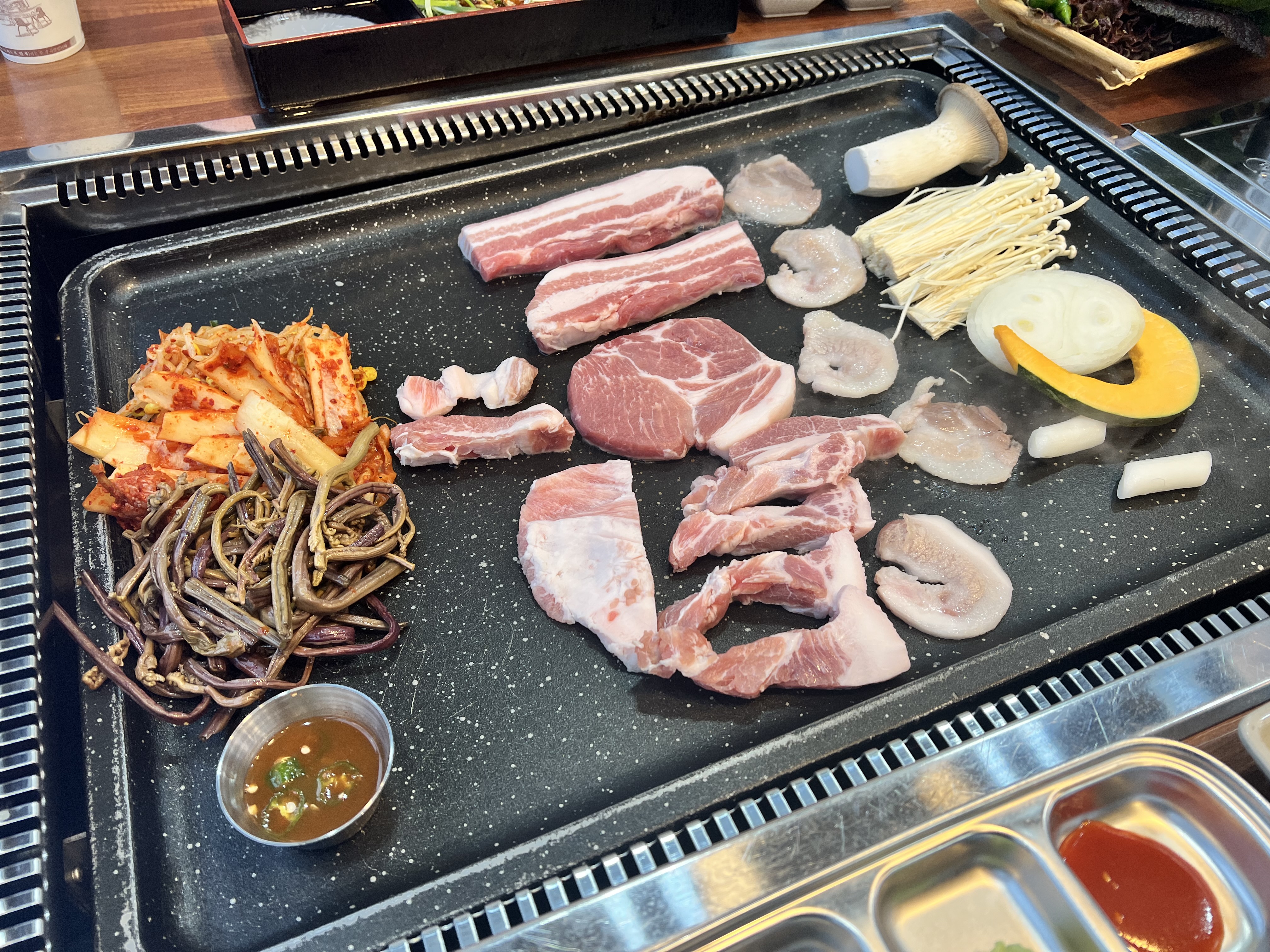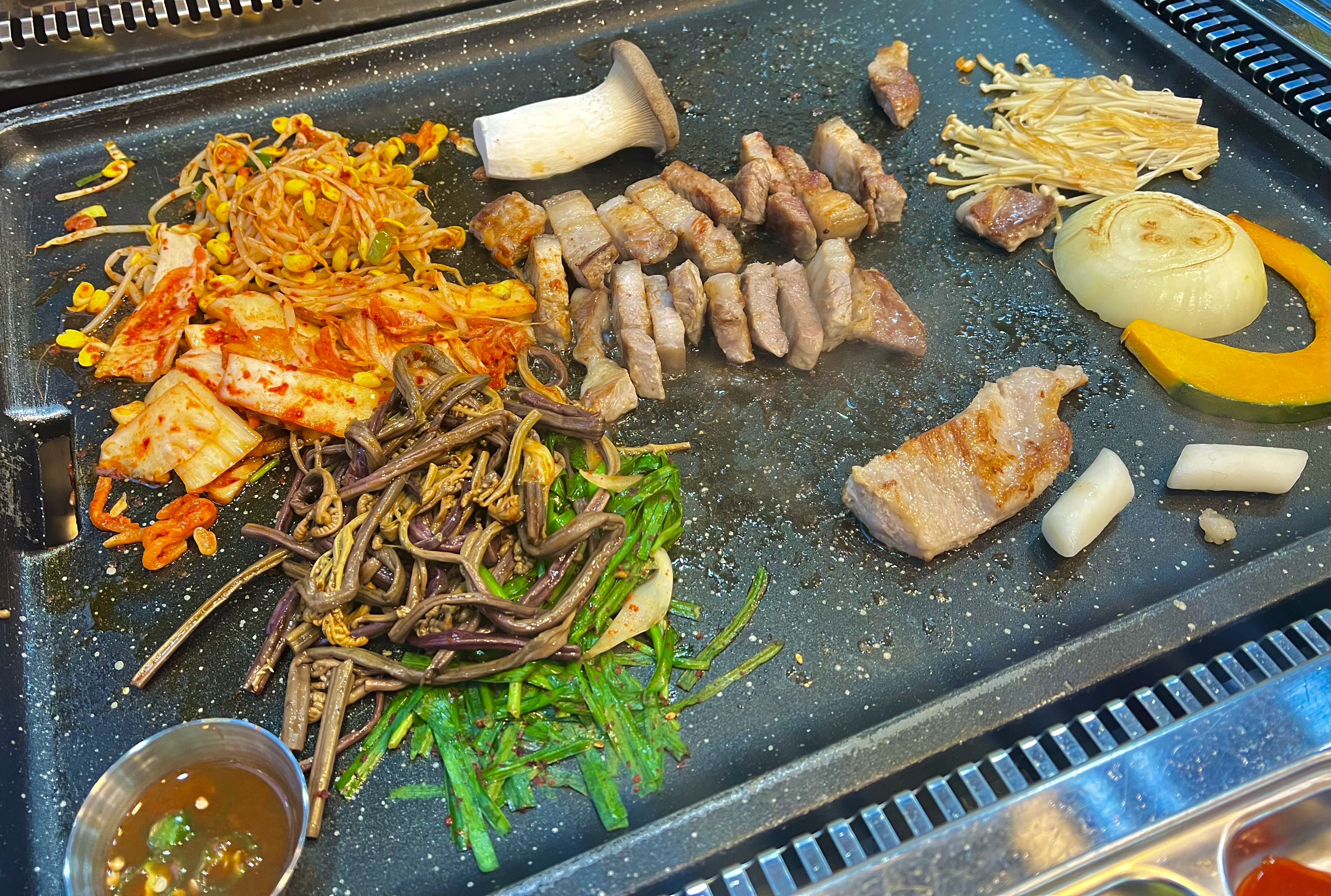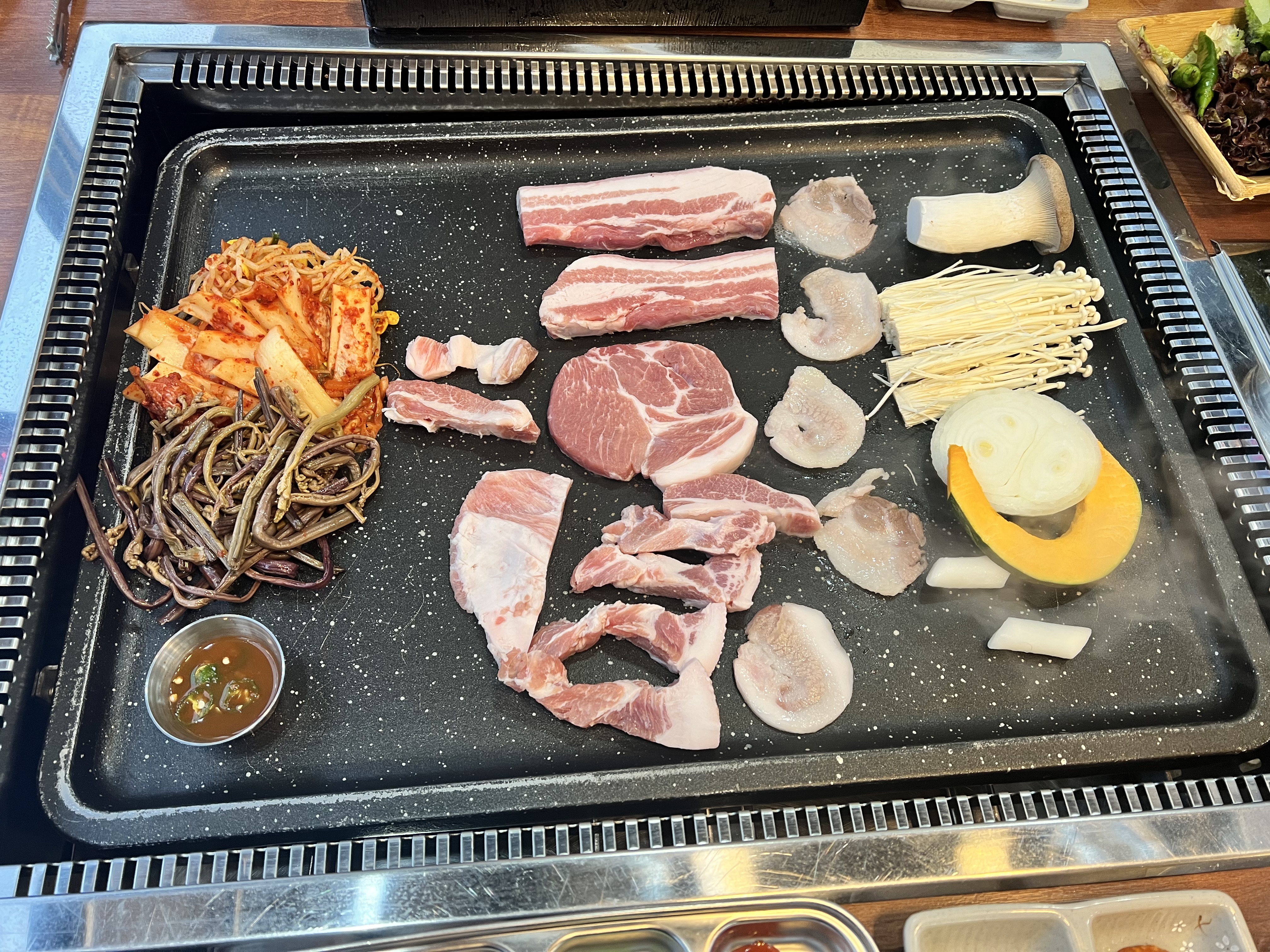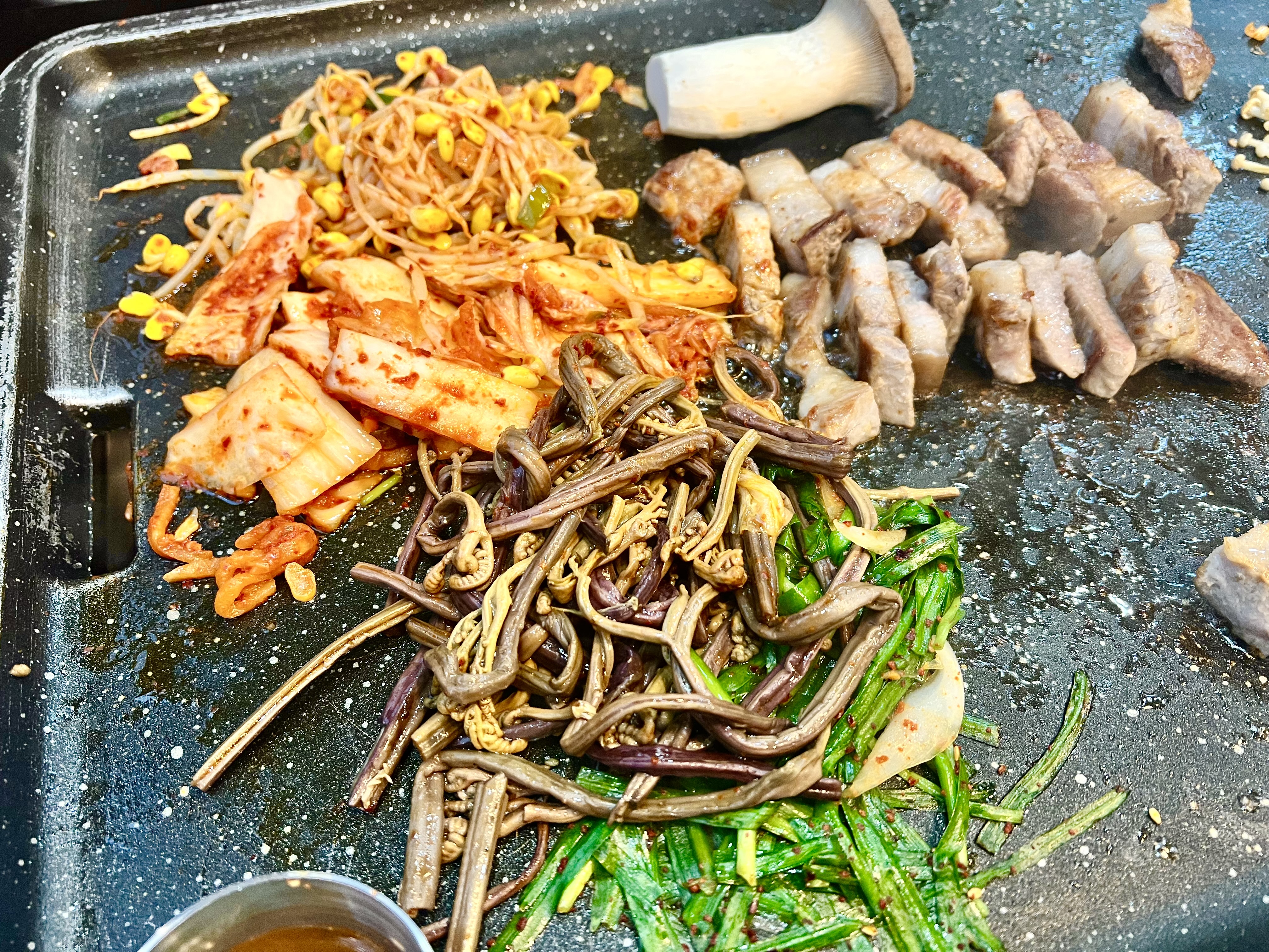 불판이 워낙 넓어서 김치, 고사리, 고기, 채소 등을 올려도 공간이 남습니다.
