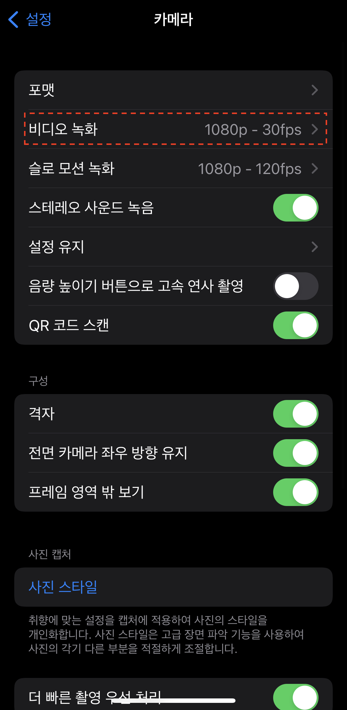 두 번째 방법은 아이폰 비디오 촬영 시 HDR로 촬영이 되지 않도록 설정하는 것입니다.