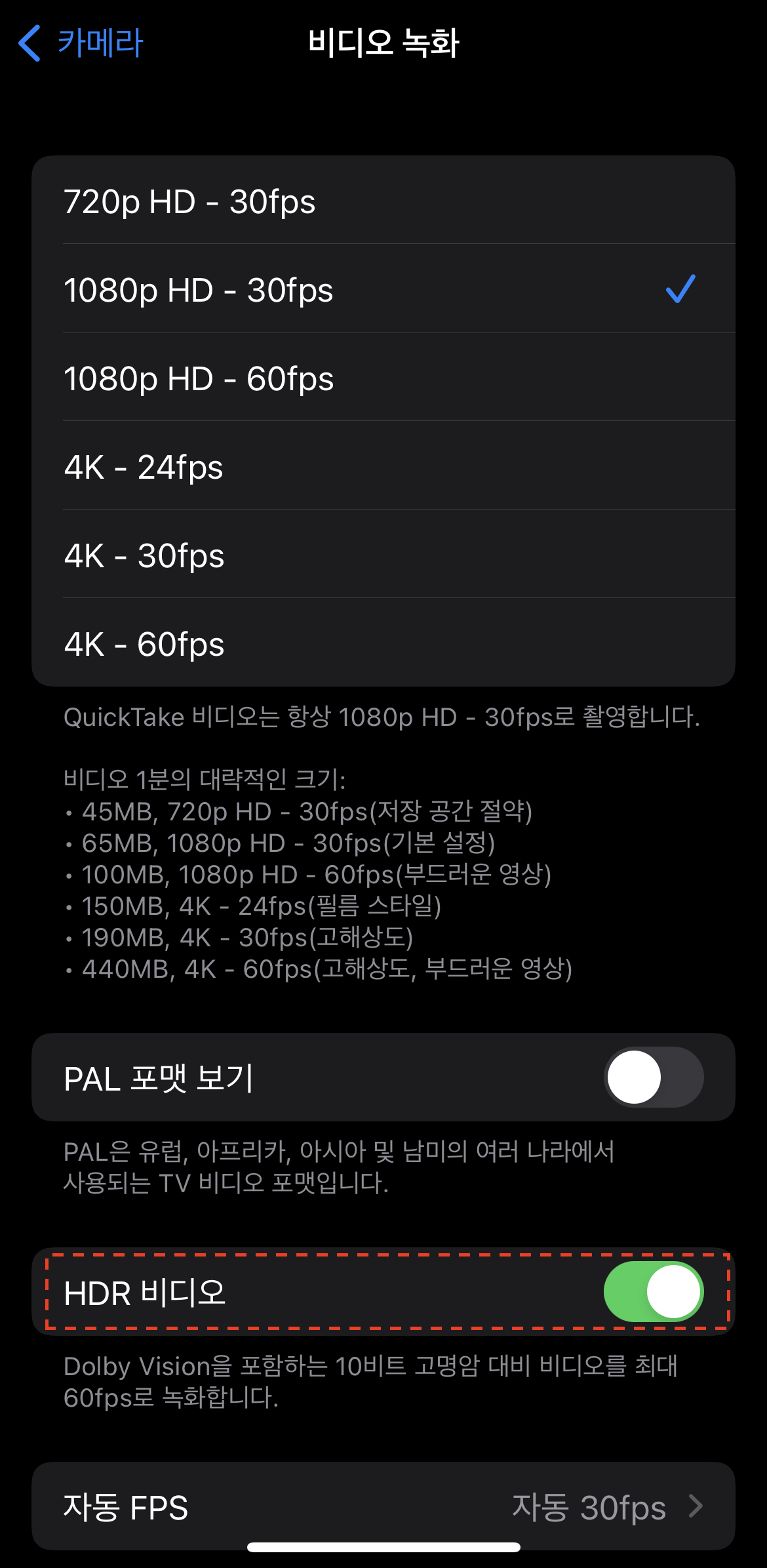 2. 아이폰 비디오 촬영시 HDR 미사용으로 설정