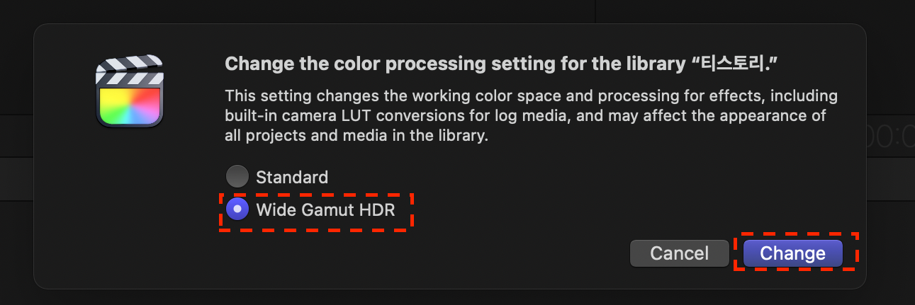 파이널컷에서 HDR 영상을 인식하도록 변경하느냐,