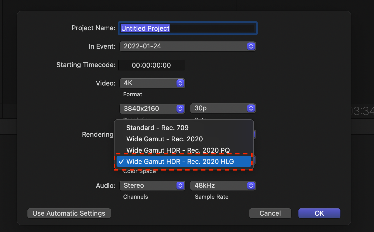 (4) New 프로젝트를 생성할 때 렌더링 설정을 "Wide Gamut HDR - Rec. 2020 HLG"로 설정합니다.