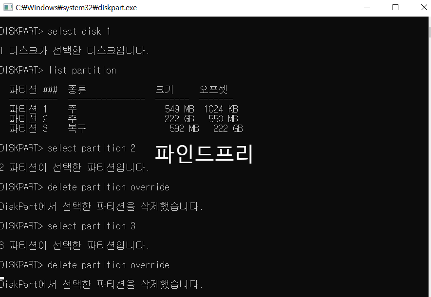 "delete partition override"를 입력하여 파티션 2를 삭제해줍니다.