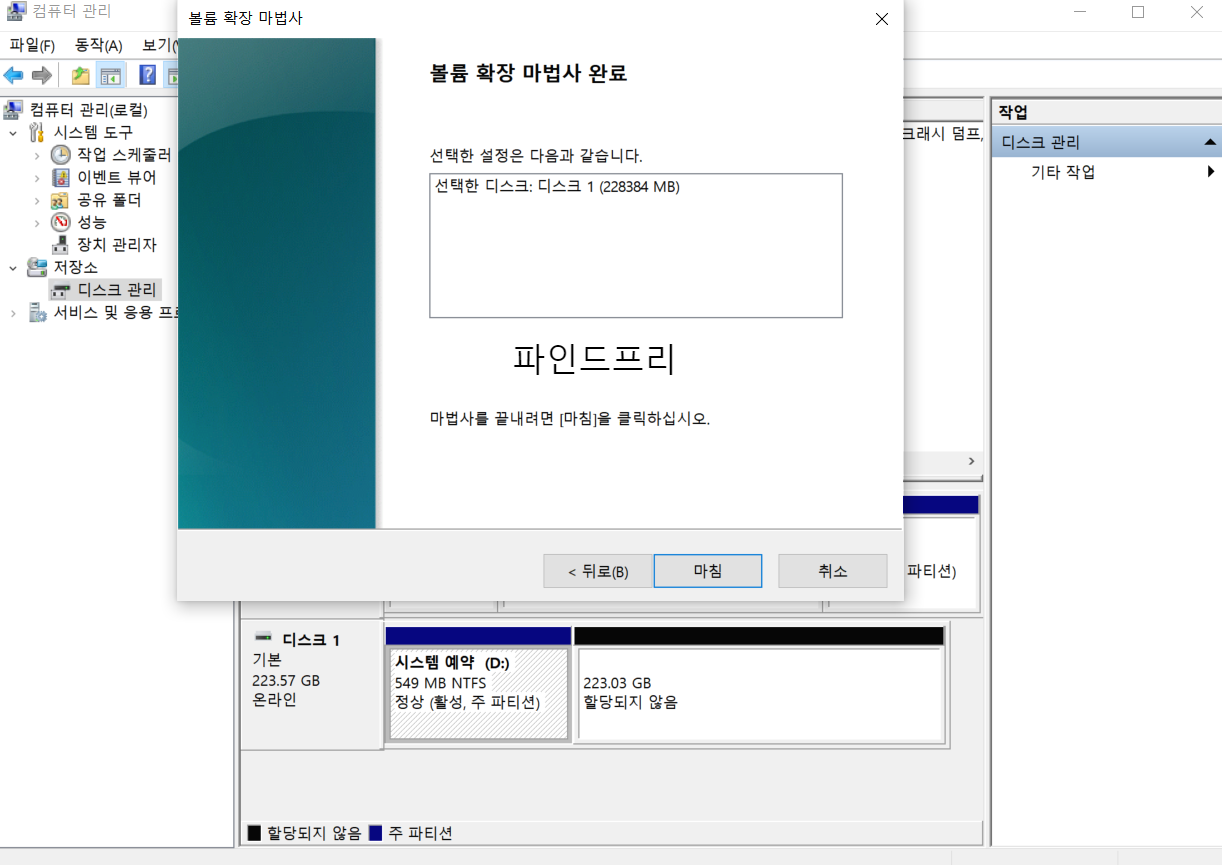 볼륨 확장이 완료되었다는 화면을 볼 수 있습니다. 마침을 눌러줍니다.