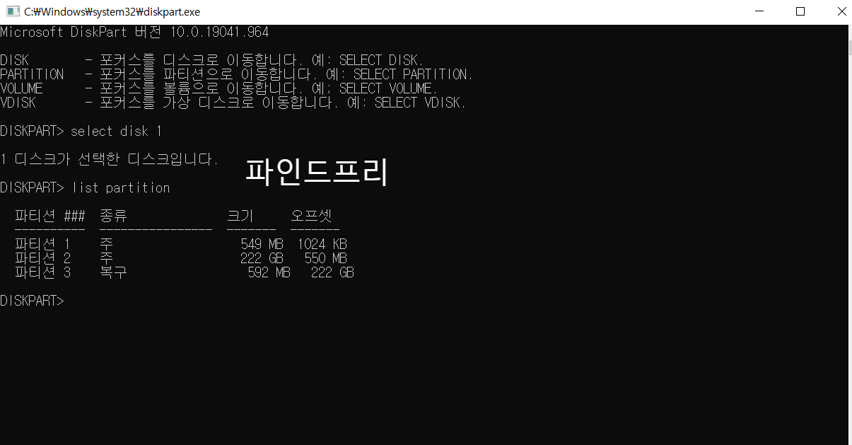 그 후 "list partition"을 입력하여 파티션 리스트를 확인합니다.