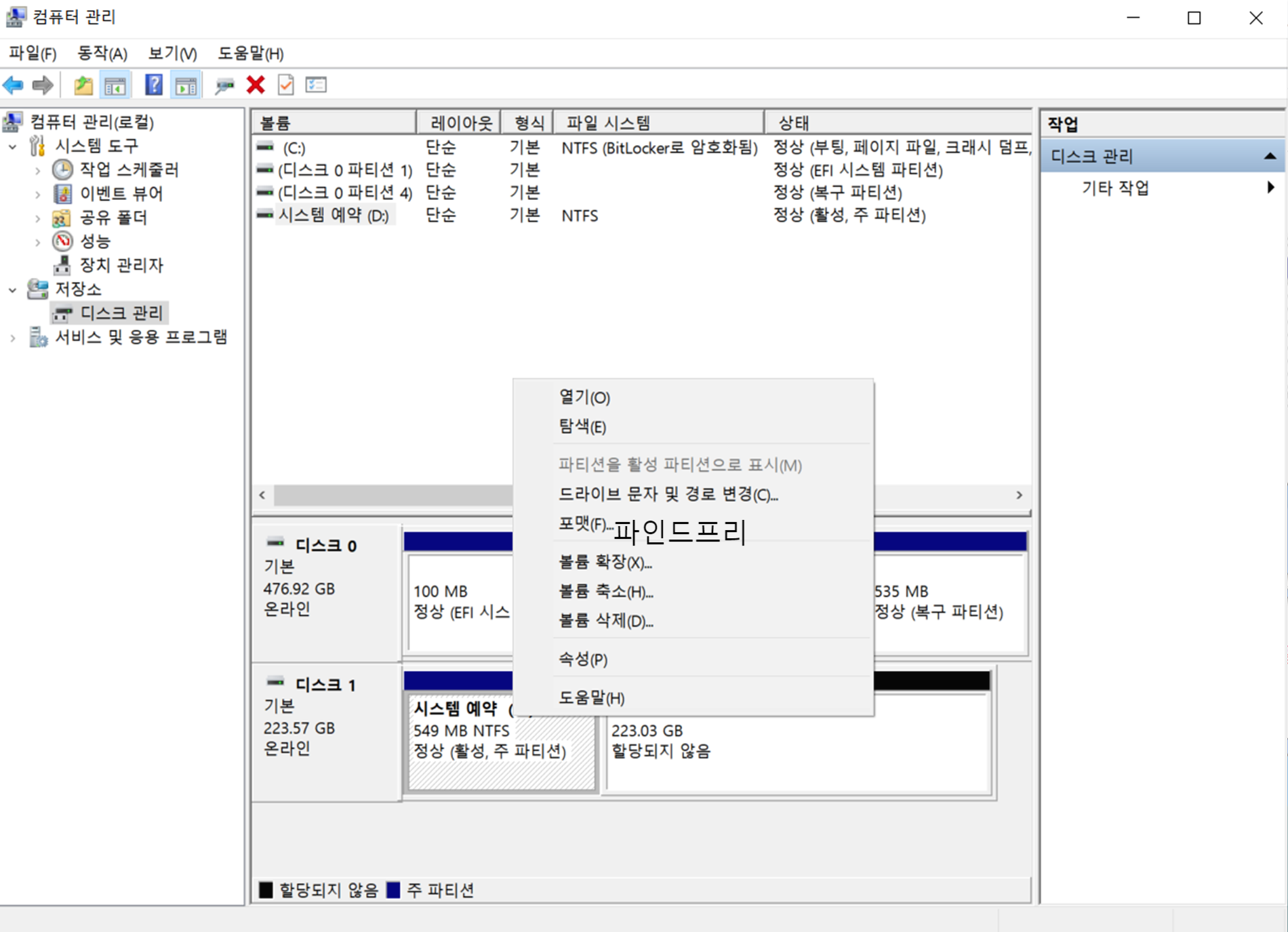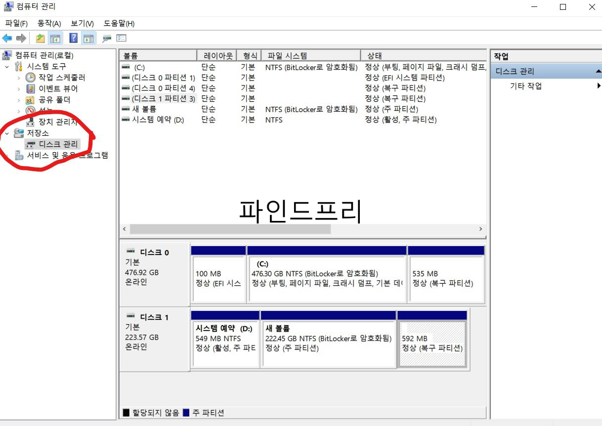 "저장소" 하위 폴더에 있는 디스크 관리를 클릭하시면 아래 사진처럼 디스크 파티션 상태 확인이 가능합니다.