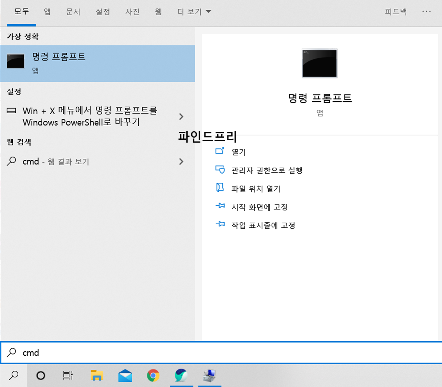새로 설치한 디스크 번호를 잘 기억하신 후 윈도우 시작 버튼 옆의 돋보기에 "cmd"를 입력하여 명령 프로프트를 실행시킵니다.