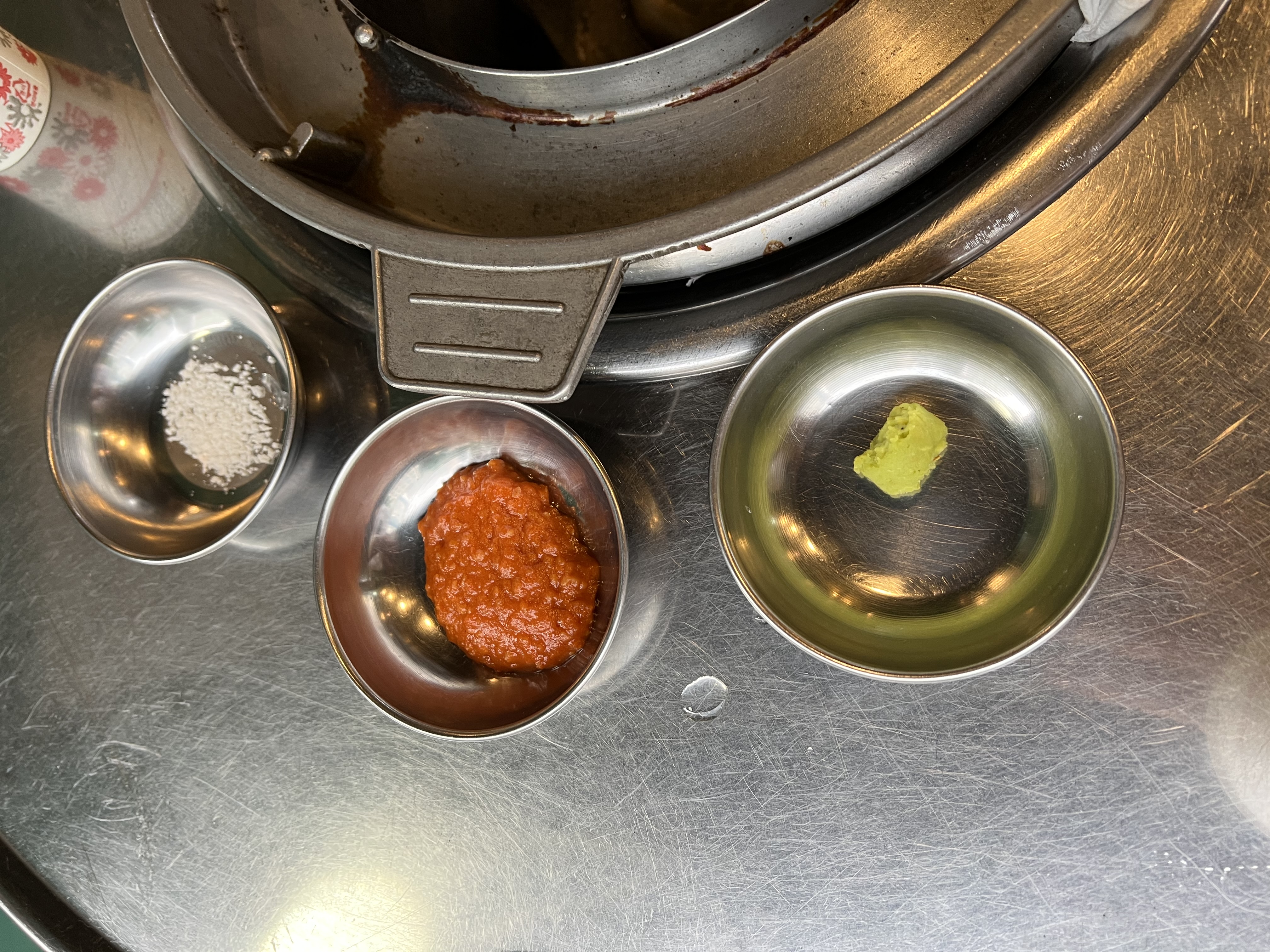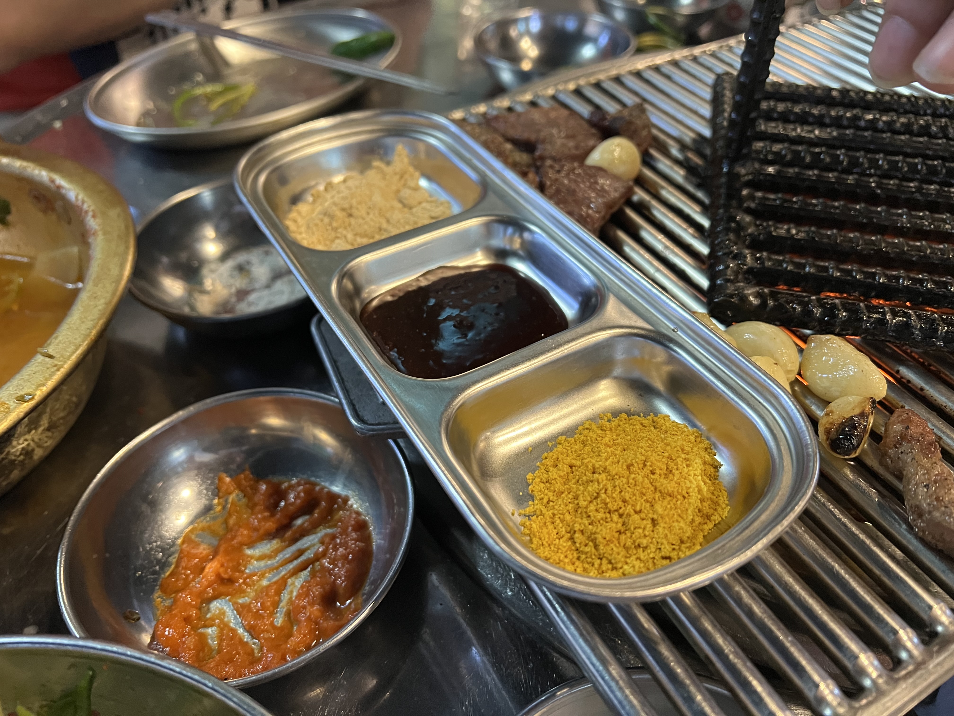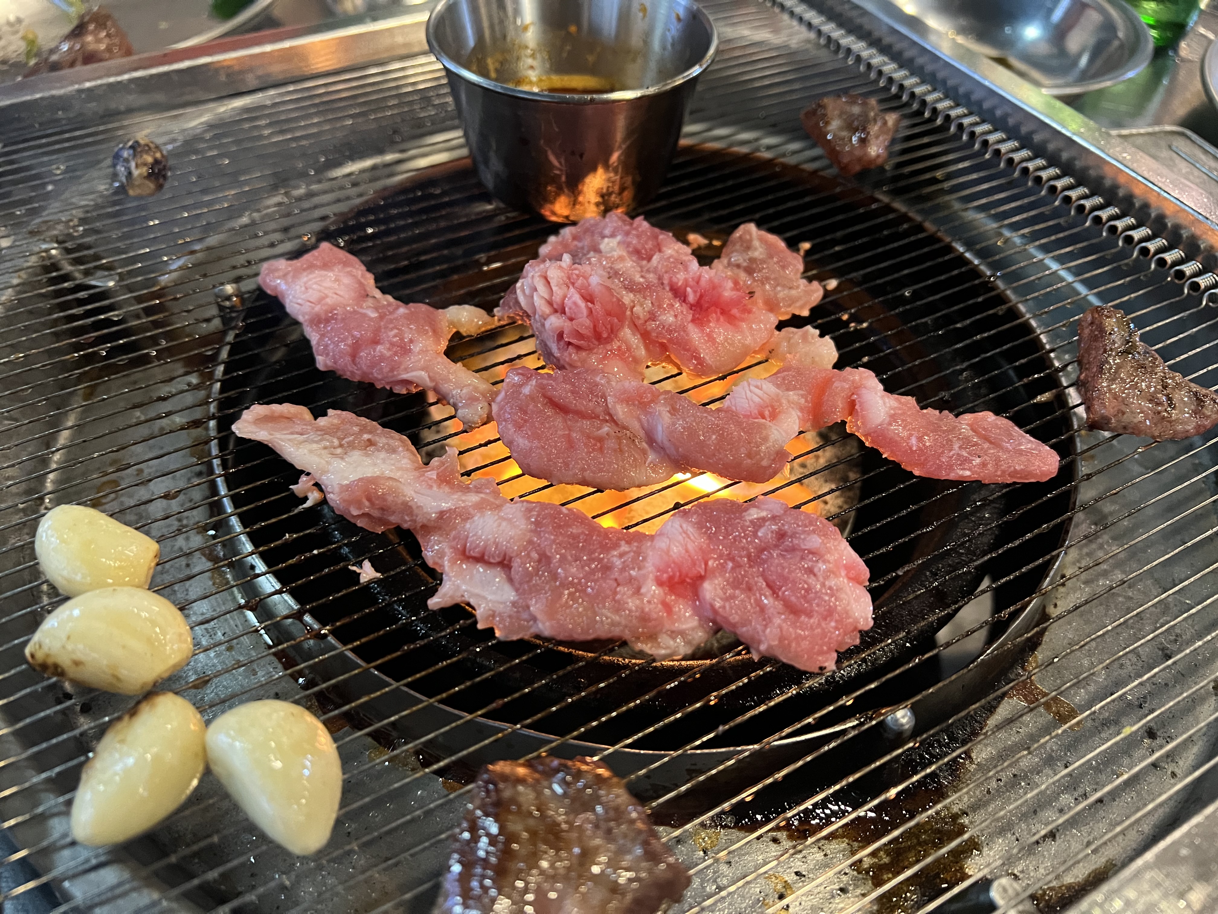 이제 고기가 제공되고 멜젓을 불위에 올리며 구울 준비를 해봅니다.