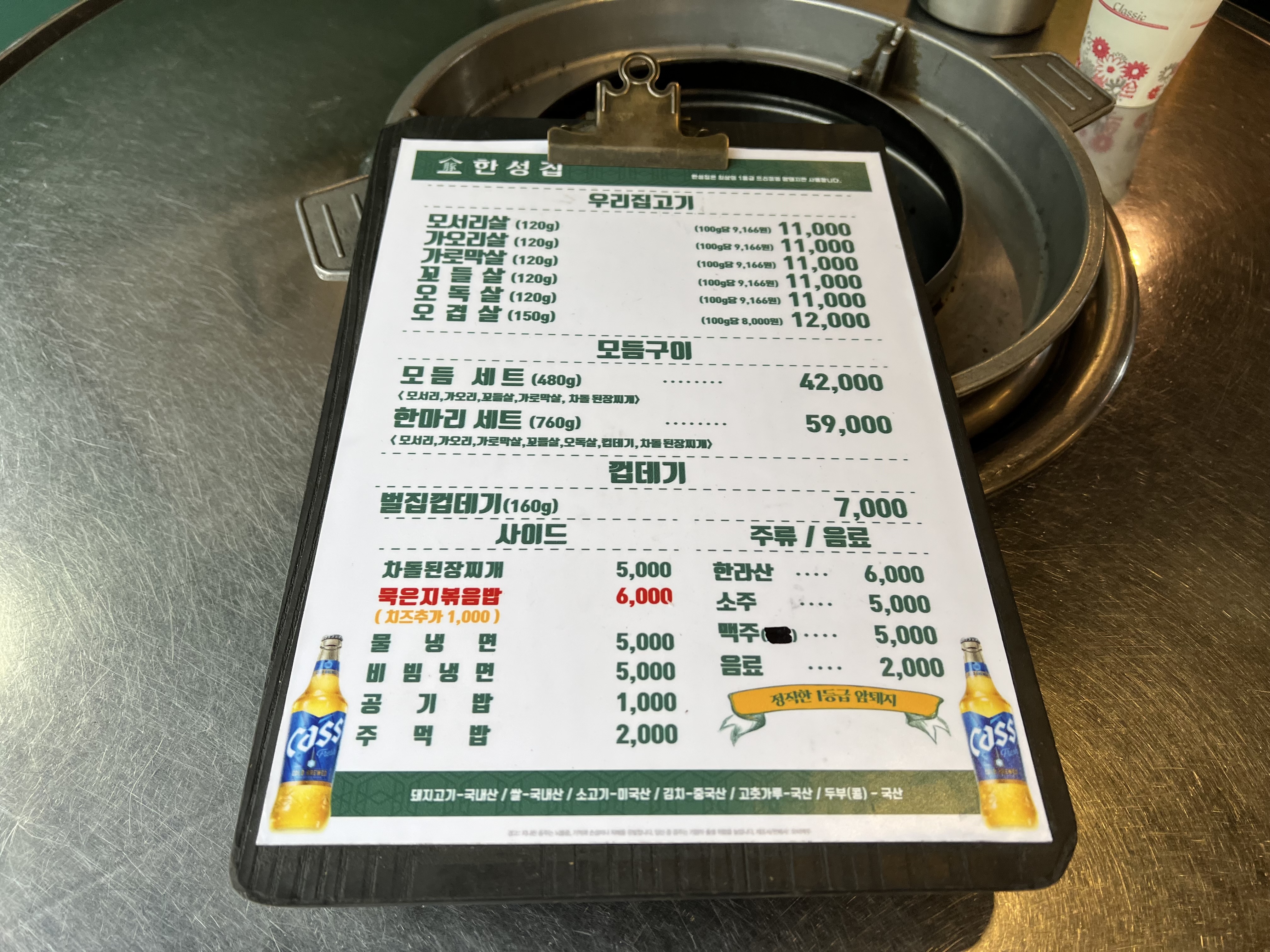 한마리 세트에는 모서리, 가오리, 가로막살, 꼬들살, 오독살, 껍데기, 차돌 된장찌개가 포함됩니다.