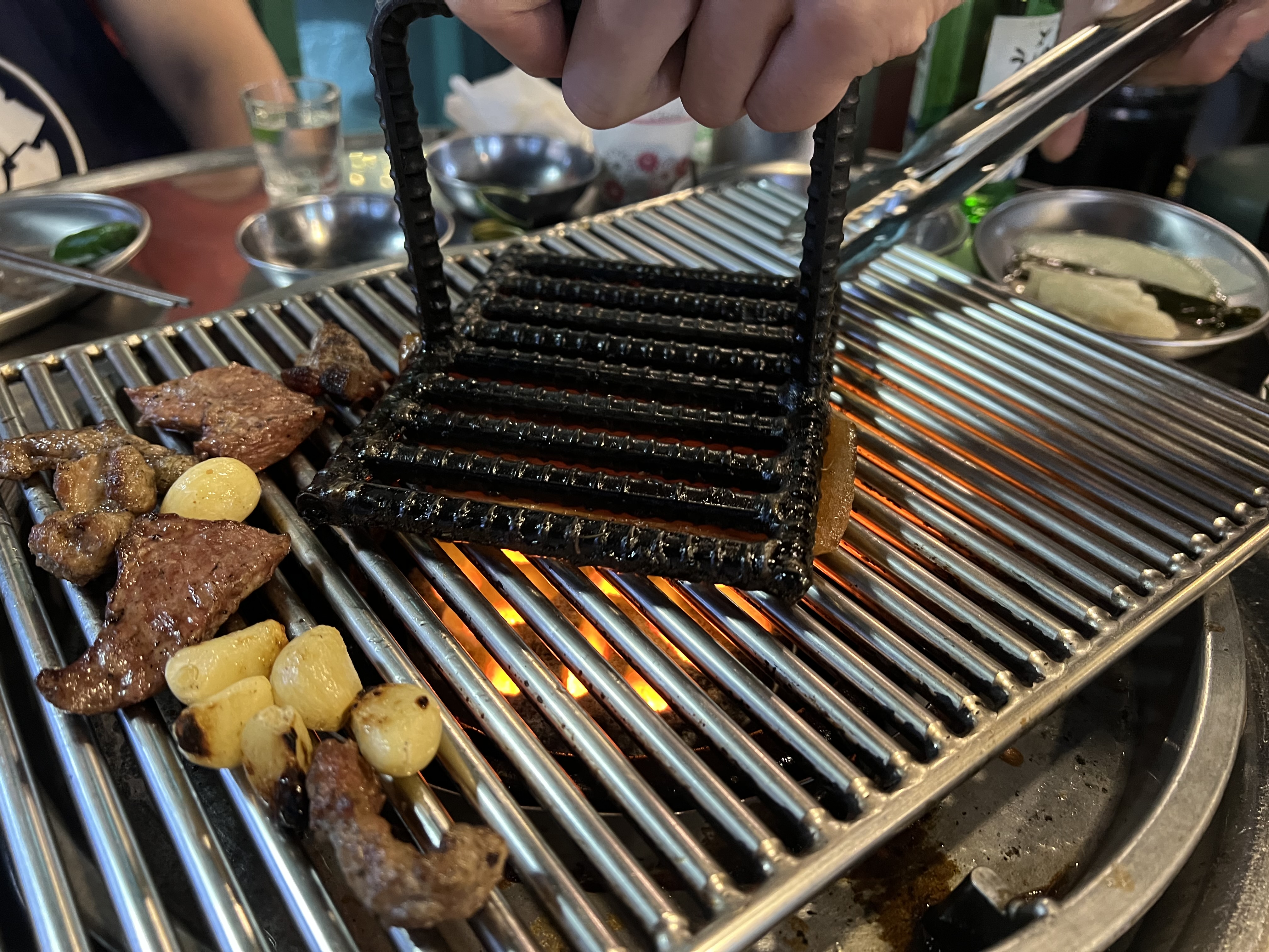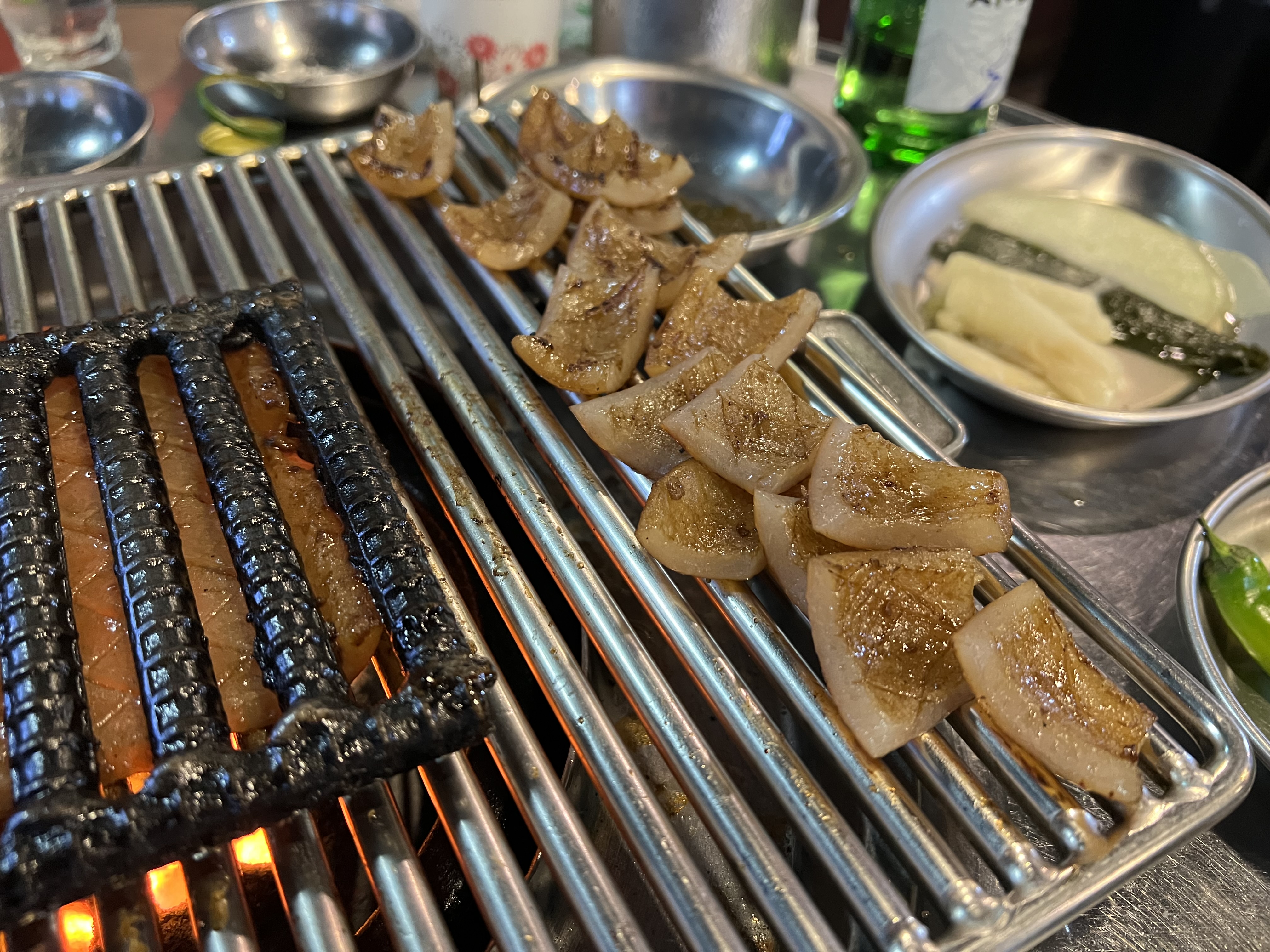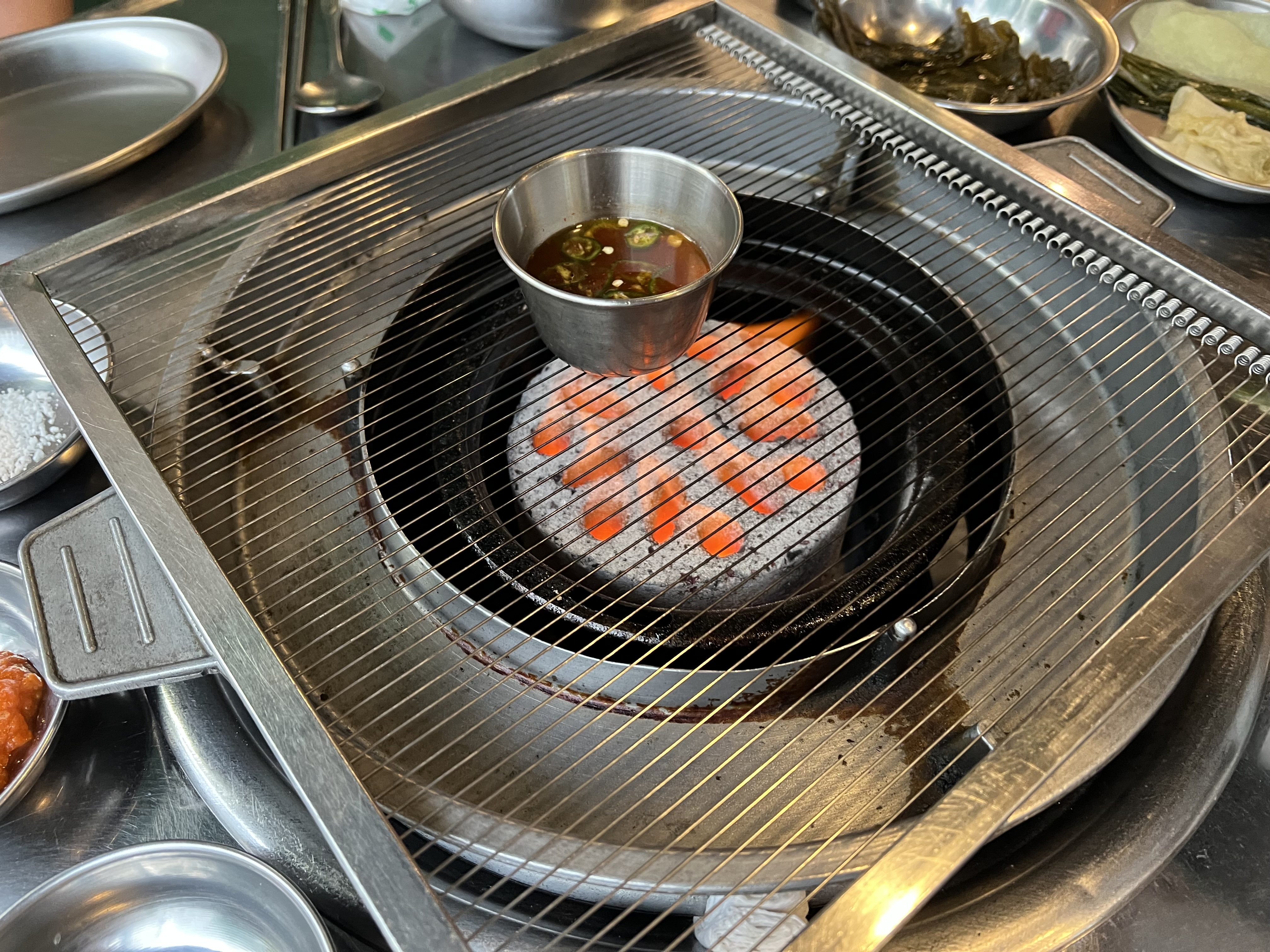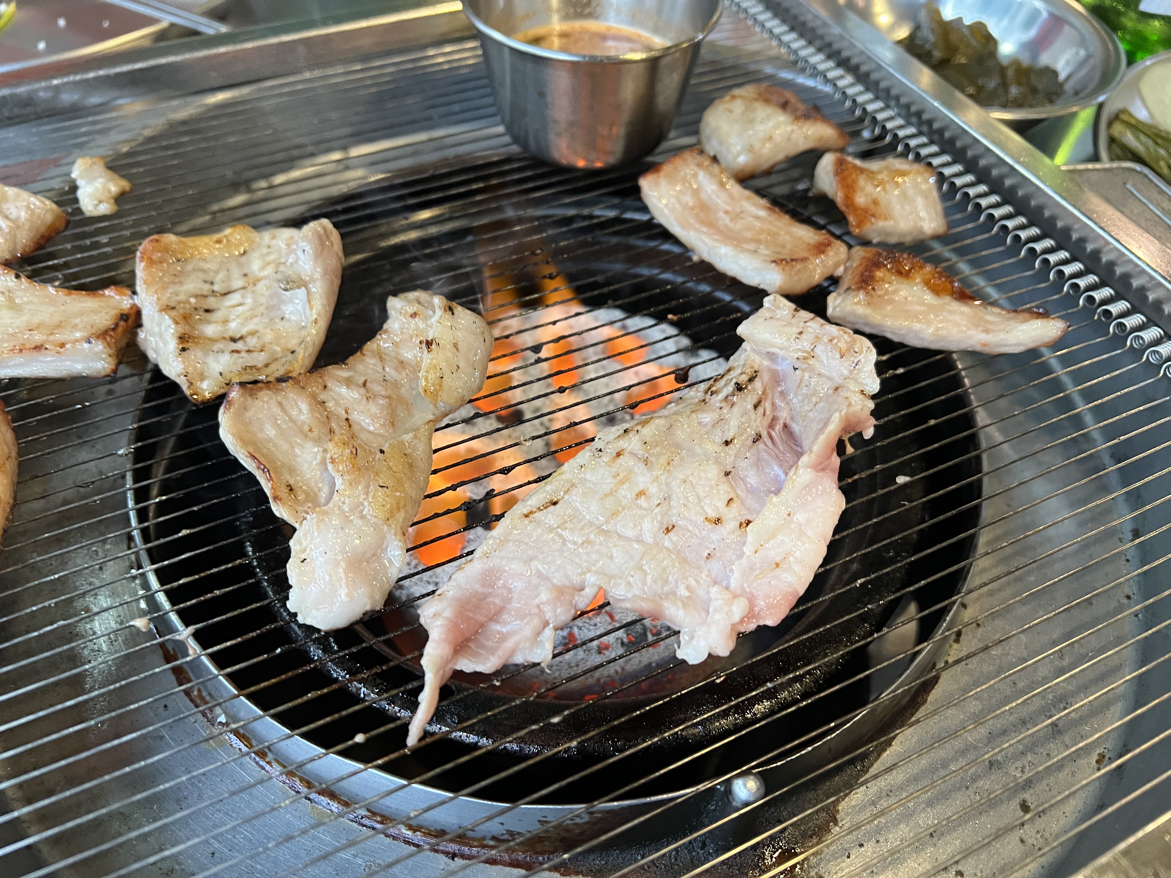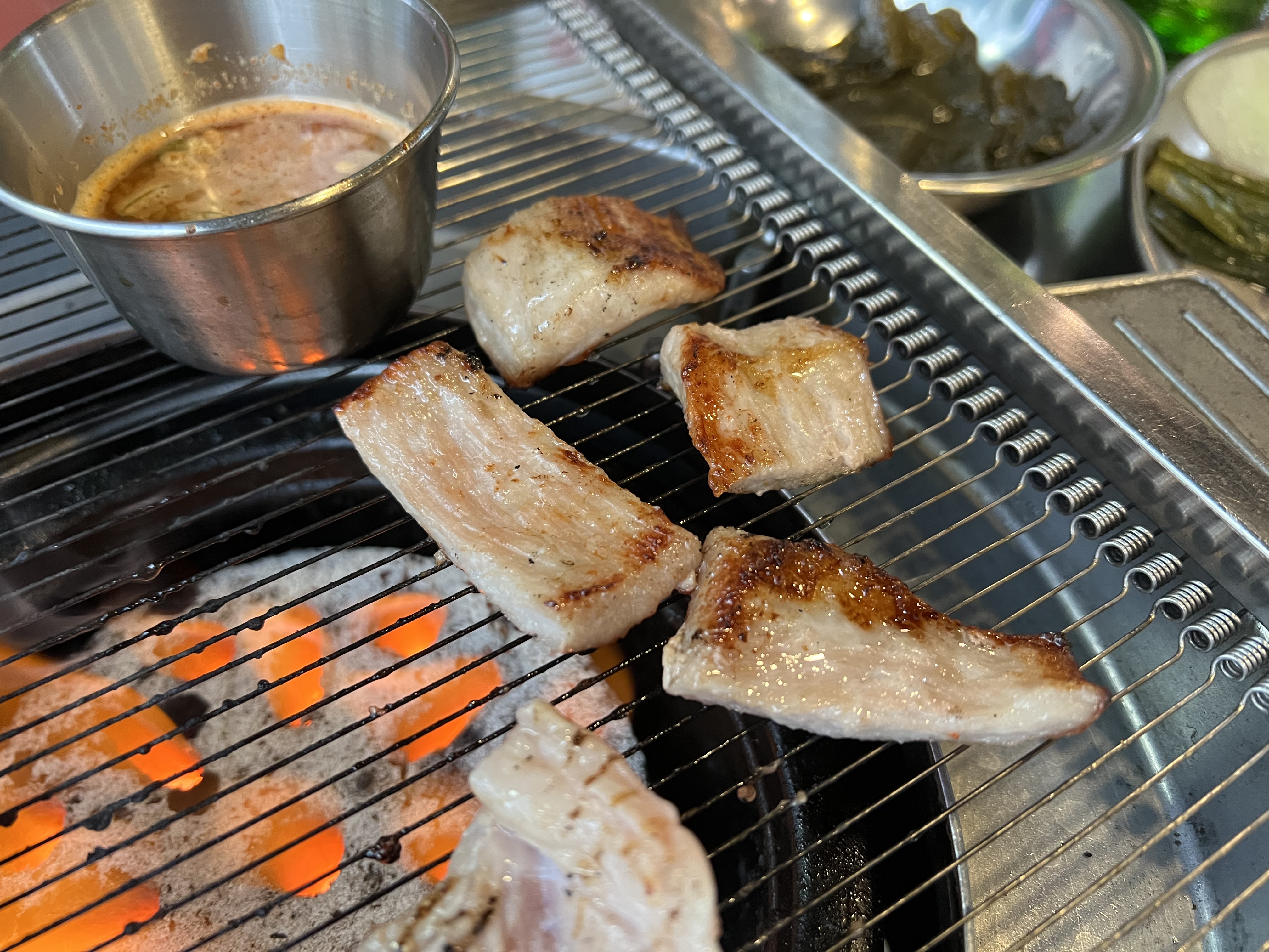 이제 고기가 제공되고 멜젓을 불위에 올리며 구울 준비를 해봅니다.