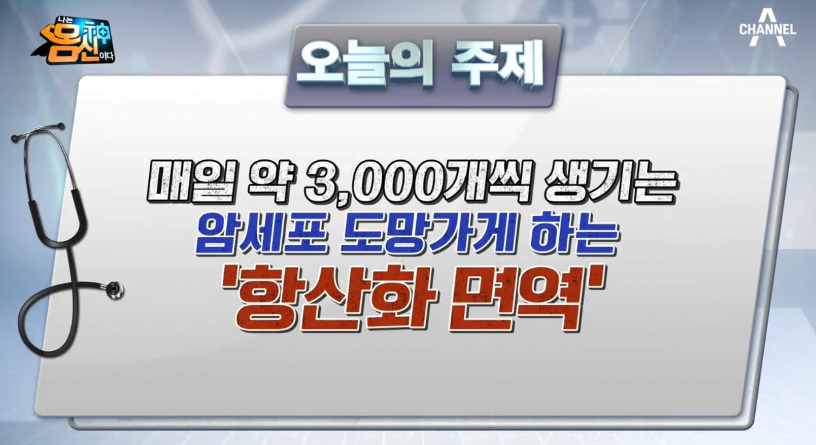우리 몸속 세포의 수는 약 20조 개가 있다고 보고 있습니다. 약 20조 개 세포 중 일부 세포는 암세포나 종양 세포로 변화합니다. 누구나 암을 일으키는 세포가 매일 약 3,000개씩 생성과 사멸을 반복하고 있습니다. 하루 약 3,000여 개의 암세포가 생기지만 암이 발병하지 않고 건강하게 살 수 있는 이유가 있습니다. 그 이유는 바로 항산화 면역입니다. 면역이란 외부에서 우리 몸으로 들어오는 세균이나 바이러스 같은 이물질과 몸 안에서 생긴 염증이나 암세포 같은 몸에 없었던 것을 없애는 능력을 말합니다. 면역은 우리 몸안에 면역 세포가 여러 가지 역할을 하는 건데 면역 세포가 역할을 하기 위해서는 무기가 필요합니다. 어떤 무기를 쓰느냐에 따라 승패가 갈리기도 하는 전투처럼 항산화라는 무기가 있으면 면역 세포가 더 강하게 싸울 수 있는 것입니다. 다시 정의하자면 항산화 면역은 SOD, 카탈라아제, 글루타티온, 비타민 C, 비타민 E, 각종 미네랄 등 100여 가지 항산화 물질이 면역 세포를 도와 암세포 같은 이물질을 빠르고 강력하게 사멸시키는 것을 말합니다.