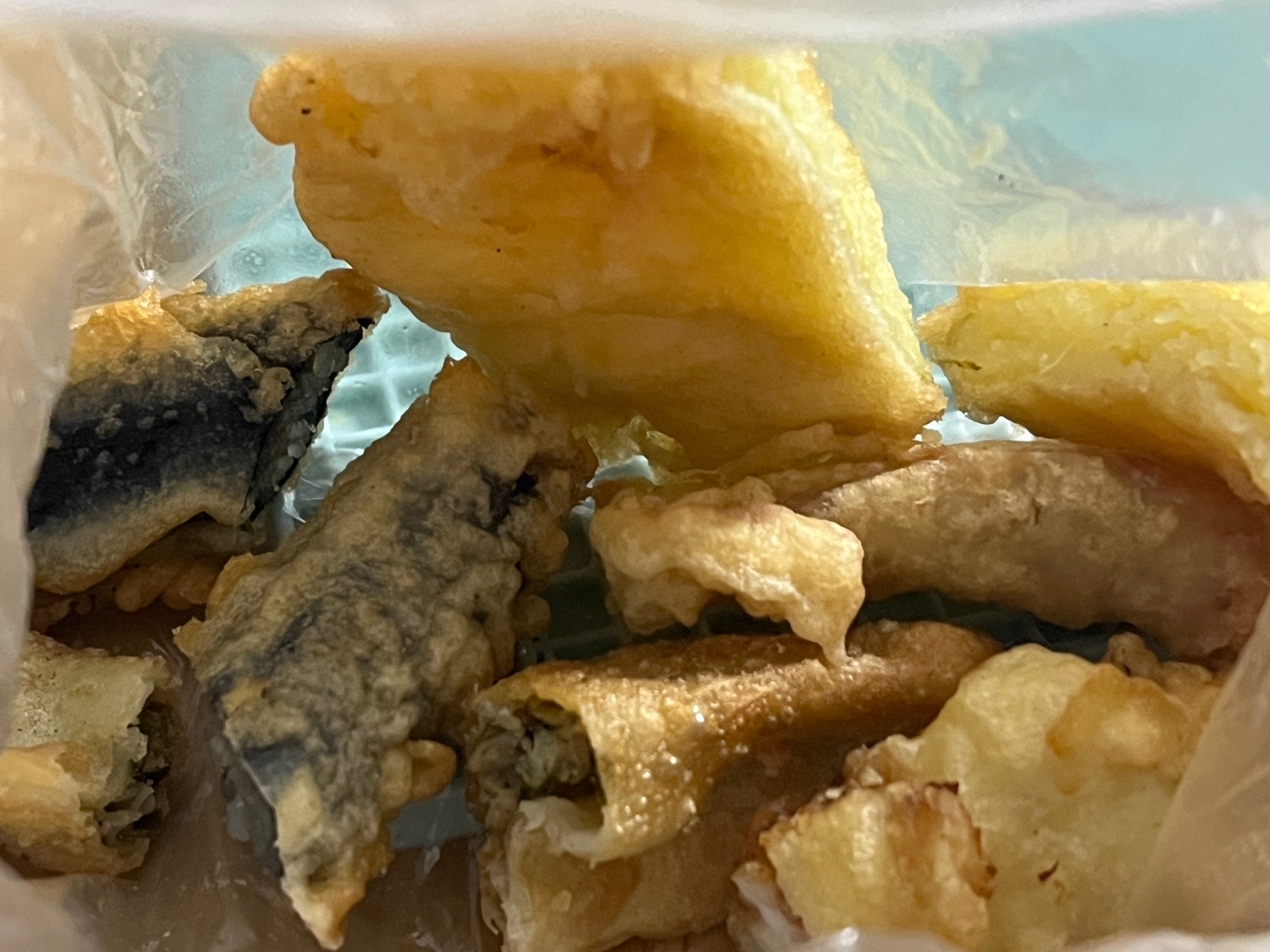 마지막으로 튀김입니다. 총 4개에 1인분인데 김말이, 만두, 오징어튀김, 고구마튀김을 하나씩 넣어주셨습니다. 고구마 튀김과 오징어 튀김이 맛있어서 추천드리고 만두는 사진에도 보이지만 만두소의 양이 너무 적었습니다. 김말이도 내용물이 충실한 느낌은 아니었습니다. 저라면 담엔 고구마와 오징어튀김만 포장해 달라고 할 것 같습니다.