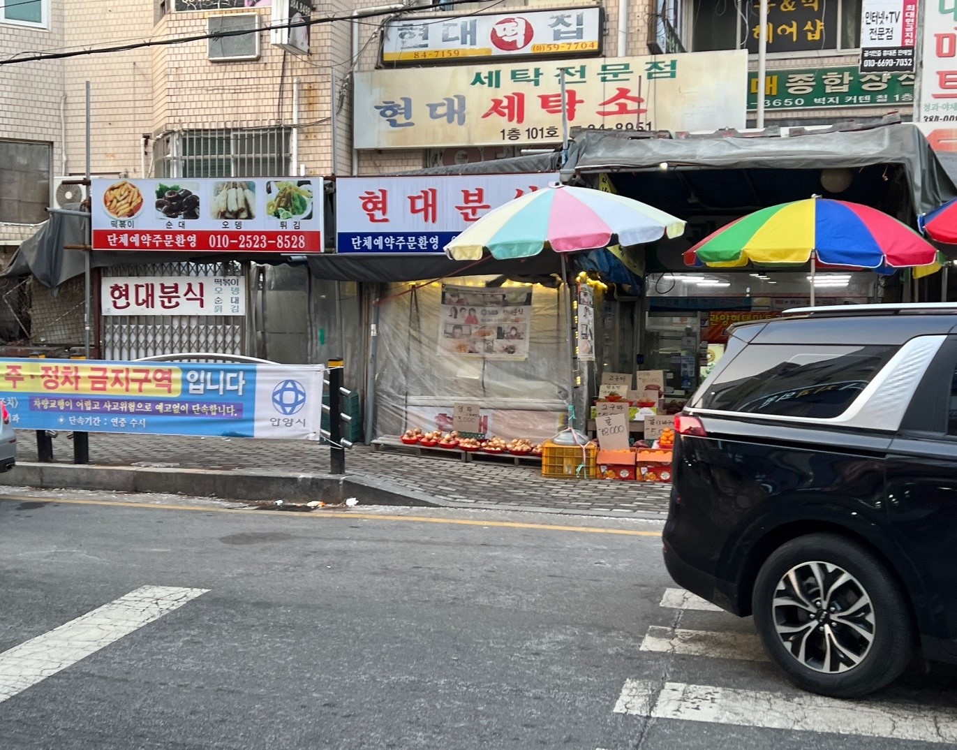 음식 중에 언제라도 생각나는 것이 있습니다. 바로 떡볶이, 순대, 튀김등의 분식입니다. 떡볶이를 좋아해서 여러 가지 떡볶이 포스팅도 올렸었는데 개인적으로 즉석떡볶이를 좋아해서 즉석떡볶이 포스팅이 많았던 것 같습니다. 오래간만에 관양시장을 방문할 일이 있었는데 즉석떡볶이가 아닌 옛날 분식집 떡볶이 즉, 학교 앞 떡볶이 맛이 그리워서 관양시장 내에 유명한 삼선당, 에벤에셀 분식이 아닌 관양시장 입구에 있는 현대분식을 방문해 보았습니다. 몇몇 포스팅을 검색해보니 방송에도 나오고 굉장히 오래 운영한 분식집 같았습니다. 외관은 옛날식 주상복합 느낌의 아파트 상가에 위치하여 있는데 건물 내에 있는 것은 아니고 입구 옆에 가건물 형태로 위치해 있습니다. 외관만 봐도 세월이 느껴지는 모습입니다.