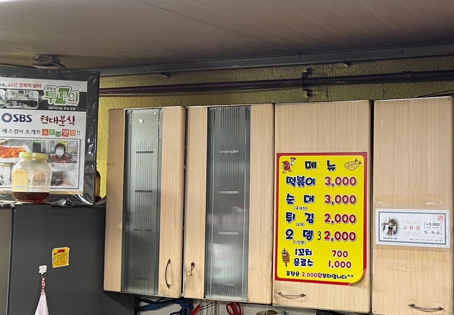 외관만큼 내부도 옛날 인테리어 입니다. 테이블이 몇 개 있어서 내부에서 음식을 먹을 수 있습니다. 점심시간 이후에 방문하였는데 이미 어르신 여러 명이서 분식을 드시고 계셨습니다. 저는 포장을 해올 예정이어서 포장 주문을 하기 위해 메뉴판을 보았습니다.