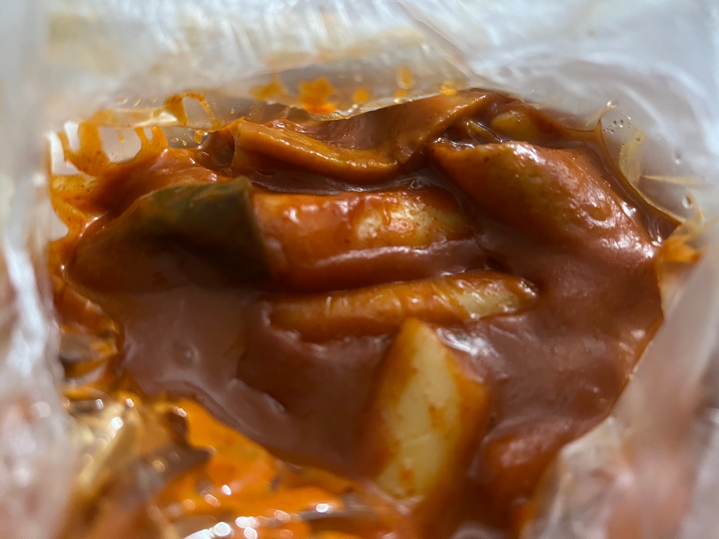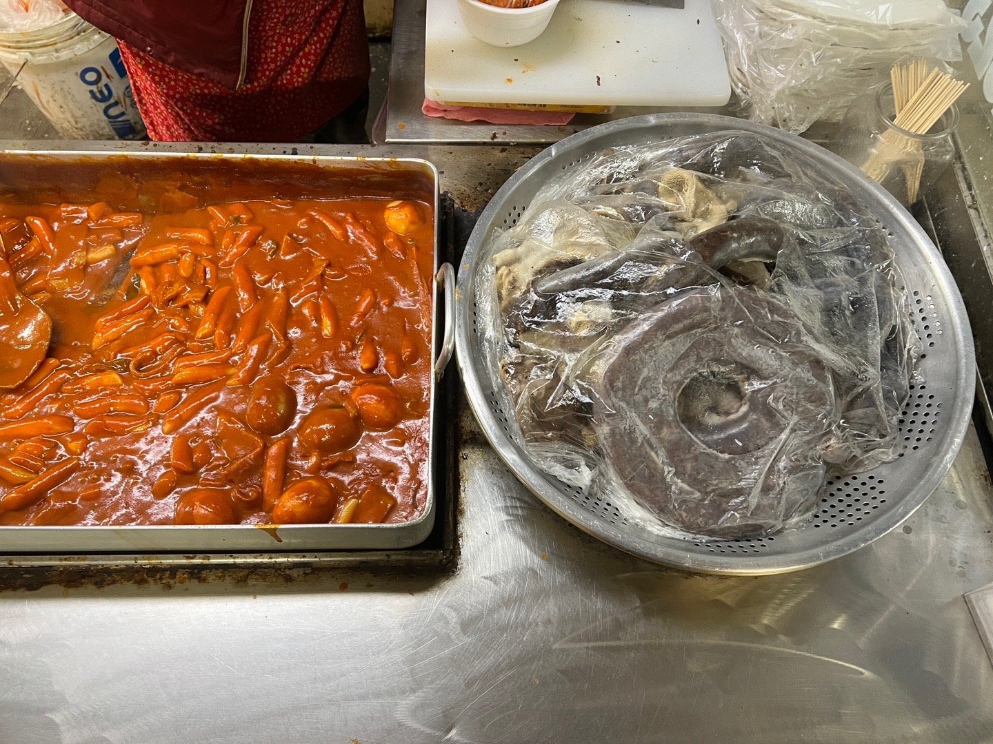 철판에서 찐~~득하게 졸여지는 떡볶이가 너무 맛있어 보였습니다. 지금 사진으로 보니 계란도 있었네요. 저의 포장된 떡볶이엔 계란은 안 들어가 있었습니다. 계란을 좋아하는 분은 떡볶이 양은 줄어들겠지만 계란을 하나 넣어달라고 하시기 바랍니다.