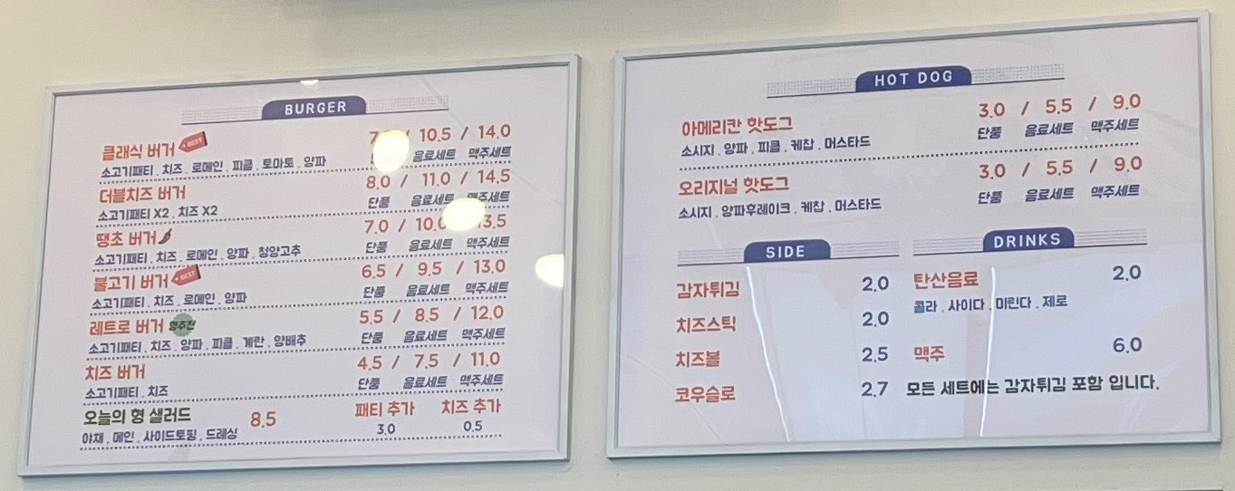 - 레트로 버거 및 핫도그까지 다양하게 즐길 수 있는 메뉴