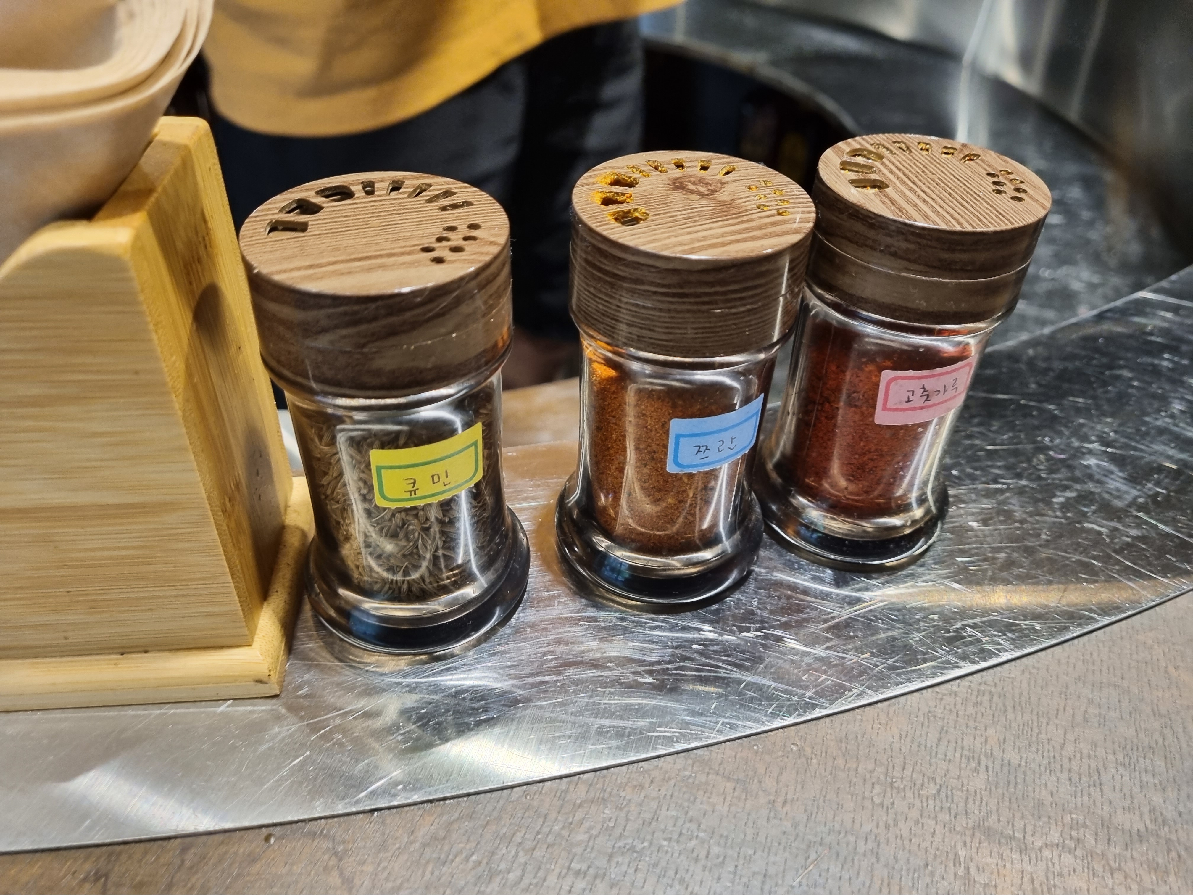 테이블 위엔 젓가락, 냅킨, 큐민, 쯔란, 고춧가루가 있었습니다.