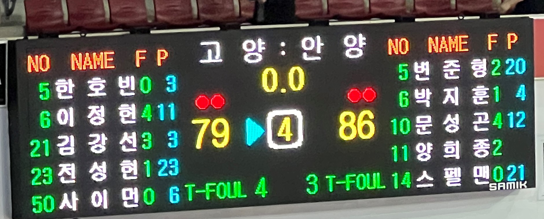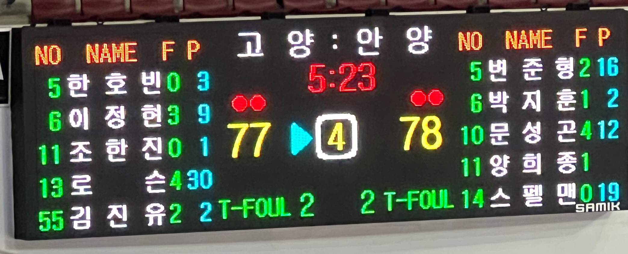 현재 1,2위답게 치열한 접전을 예상하였으나 초반에 고양 캐롯점퍼스에게 계속 밀리는 모습을 보이더니 2 쿼터 20점 차까지 뒤쳐졌습니다. 3 쿼터에서 계속 따라잡더니 4 쿼터 안양 KGC 인삼공사가 역전을 하였습니다.