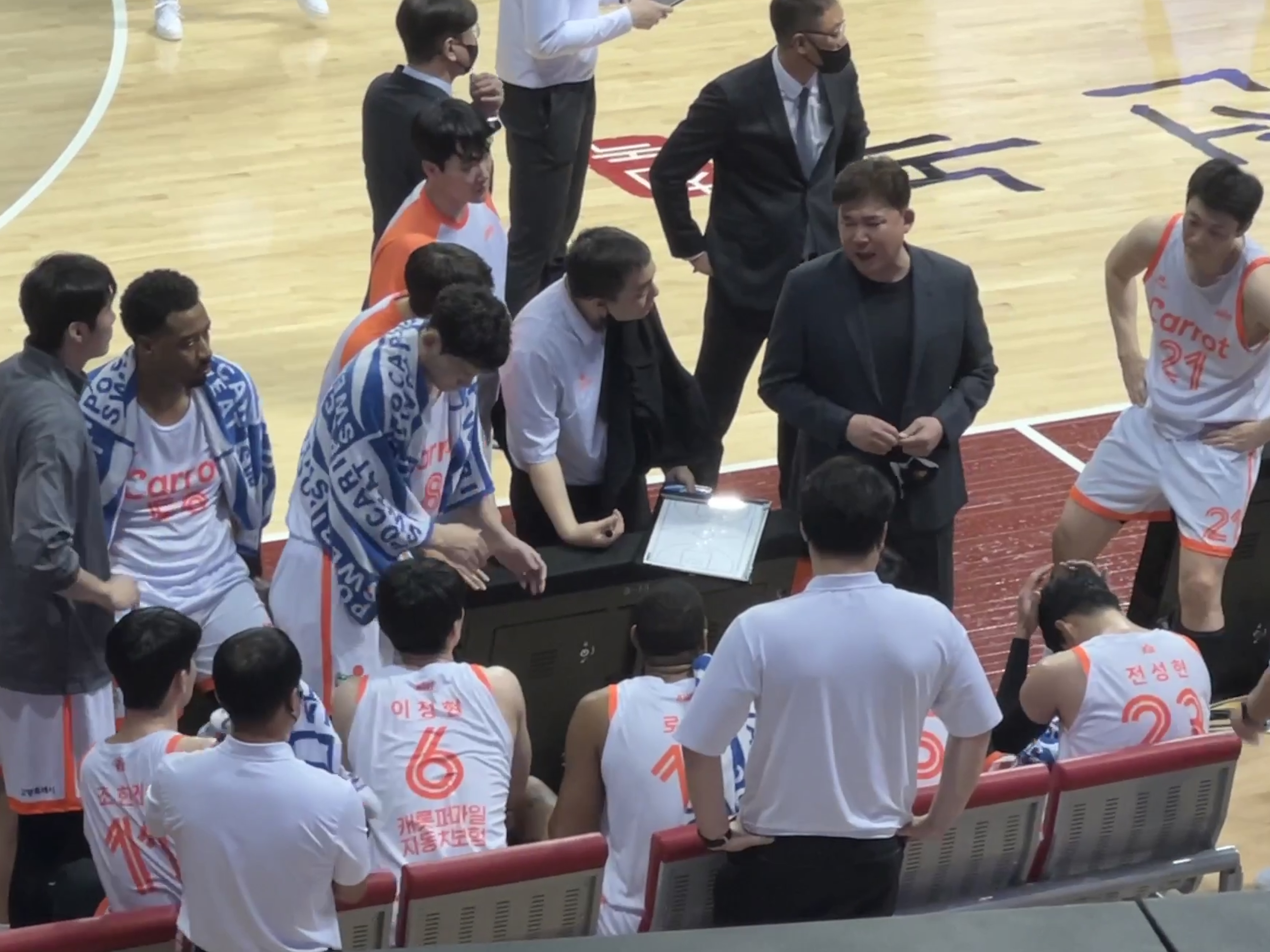 KBS 사장님 귀는 당나귀 귀에서 캐롯점퍼스 김승기 감독님이 화가 많아 보였는데 작전타임 중간중간 직원들에게 웃으며 지시하는 모습을 보였습니다. 하지만 역전을 하자 실망하며 축 쳐진 어깨는 어쩔 수 없어 보였습니다.