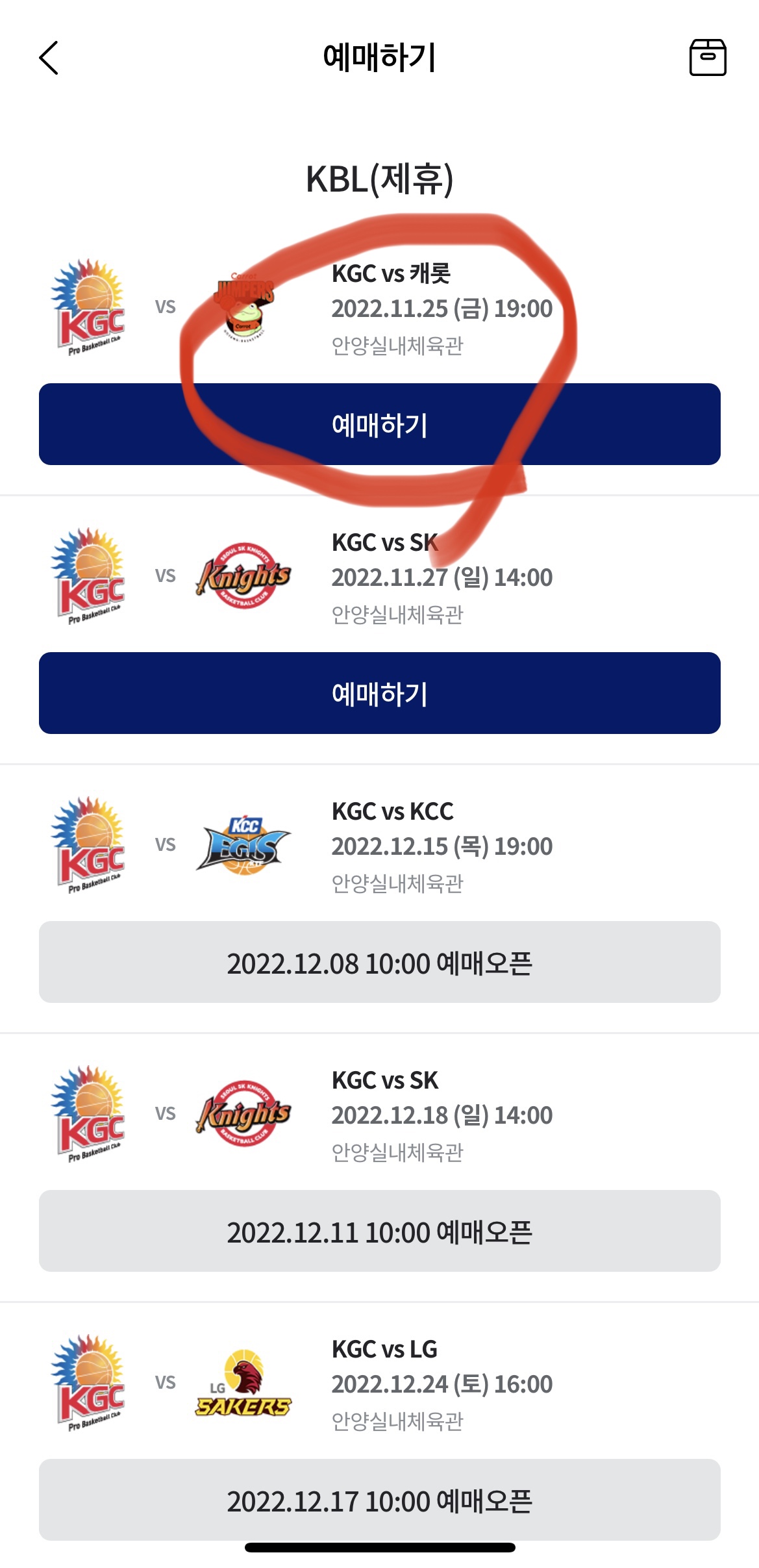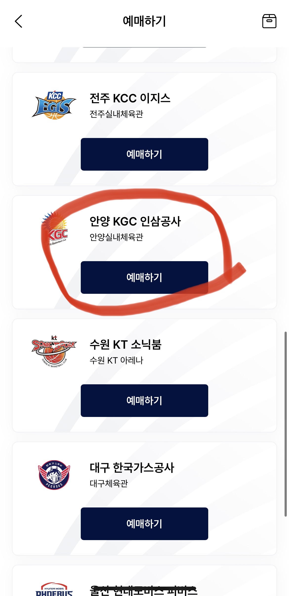 터치를 하면 KBL 각 팀이 나열됩니다. 저는 안양 종합운동장 홈경기를 볼 예정이기 때문에 안양 KGC 인삼공사를 터치하여줍니다.