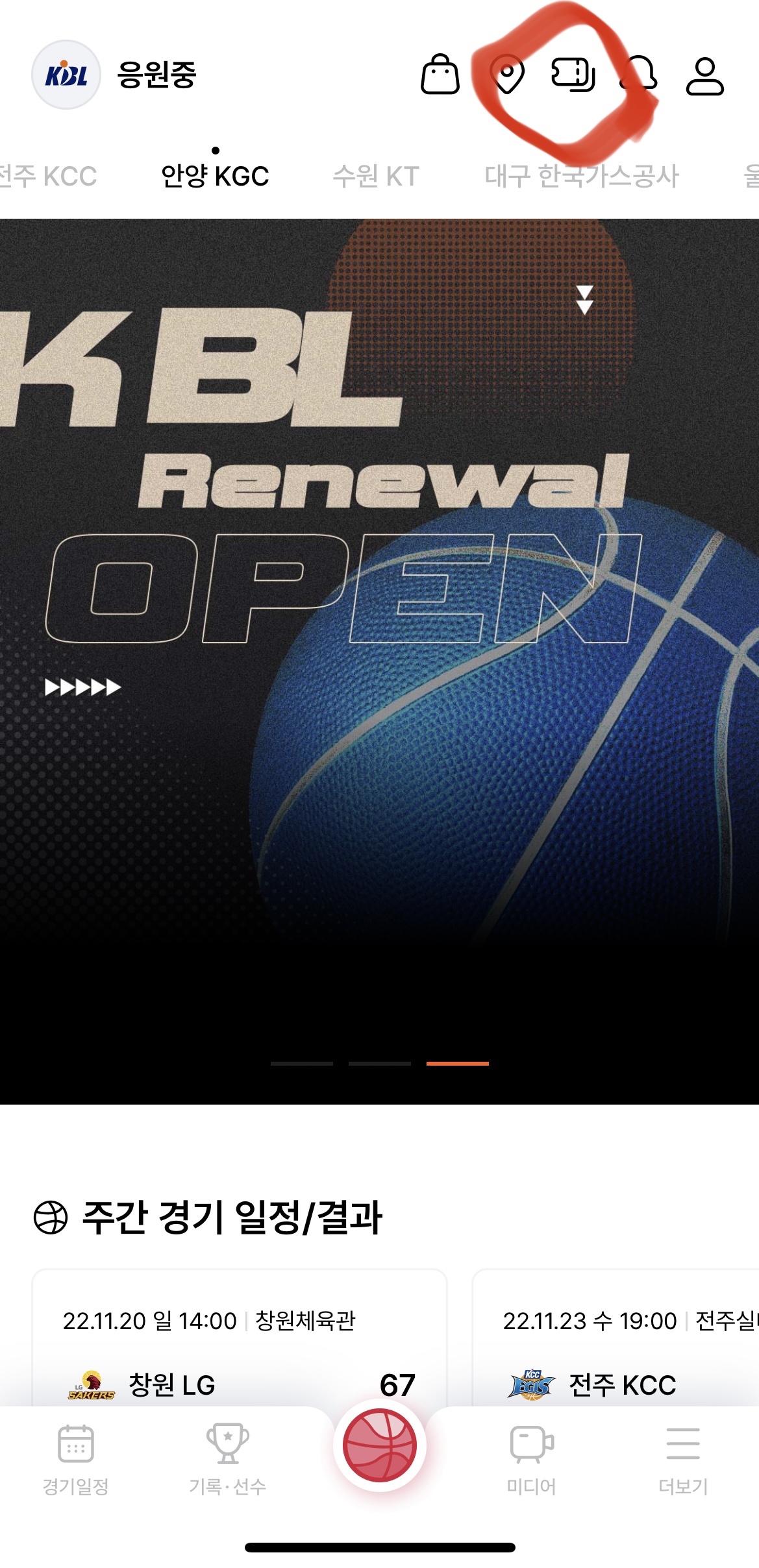 회원가입과 로그인은 제외하겠습니다. KBL 앱에 로그인하여 오른쪽 상단에 누가 봐도 티켓처럼 생긴 그림을 터치하여 줍니다.
